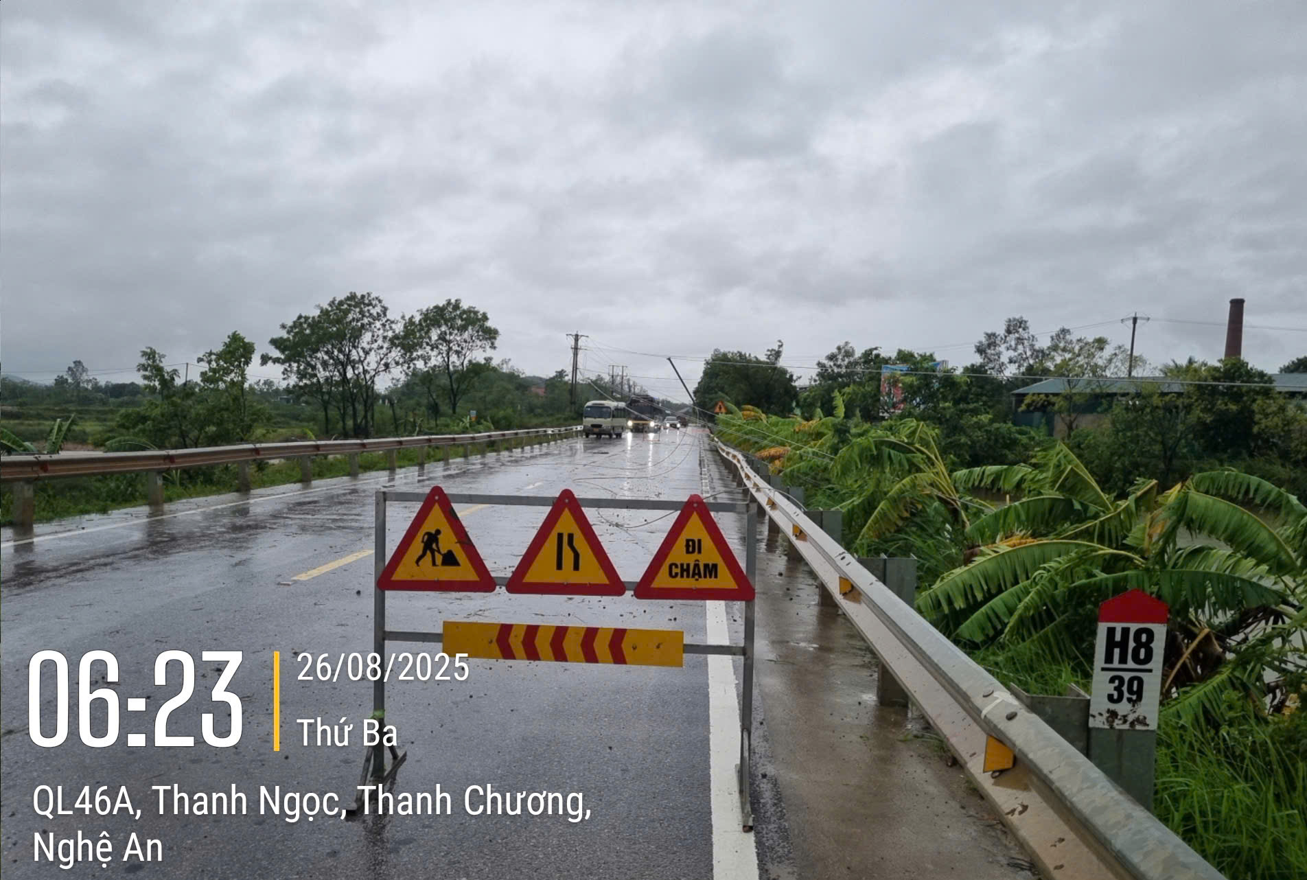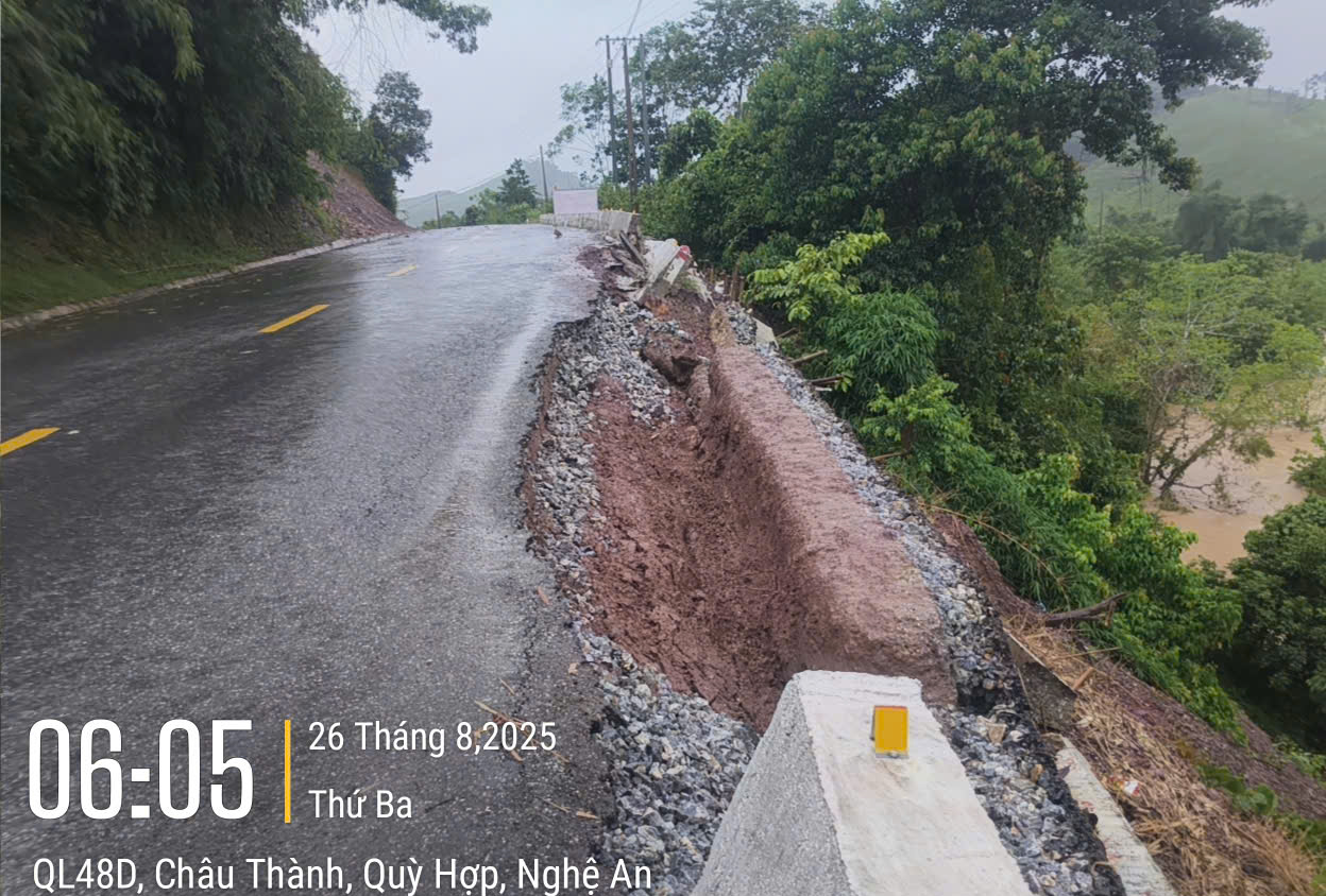 Cùng ngày, Chủ tịch UBND xã Tam Thái (Nghệ An) Lô Dương Khánh cho biết, mưa lớn từ đêm 25/8 gây sạt lở ta luy dương, đất đá tràn xuống chắn ngang QL7 đoạn bản Nhẵn. Sự cố xảy ra lúc 3h, khiến tuyến quốc lộ huyết mạch nối miền Tây Nghệ An với cửa khẩu Nậm Cắn bị tắc nghẽn hoàn toàn hai chiều.