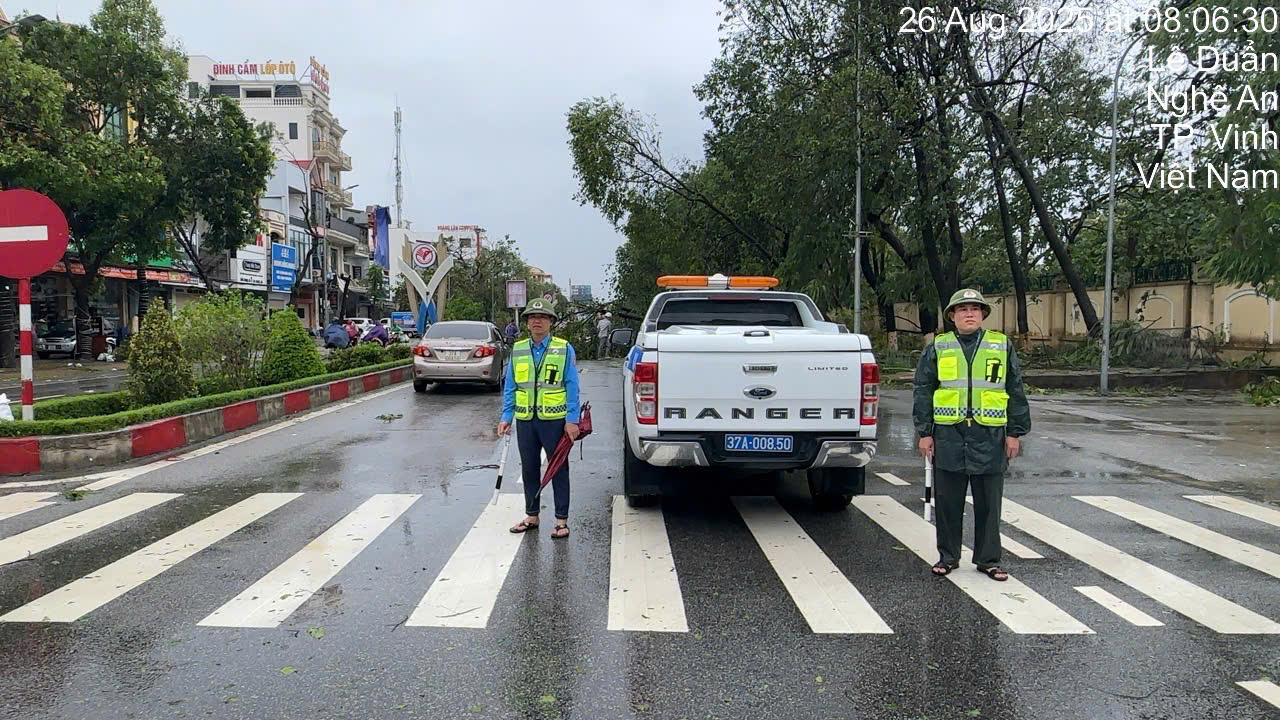 Sáng 26/8, tại TP Vinh (Nghệ An), nhiều cây xanh bật gốc, đổ chắn ngang đường gây cản trở giao thông. Lực lượng chức năng đã khẩn trương cắt tỉa, dọn dẹp để sớm thông tuyến.