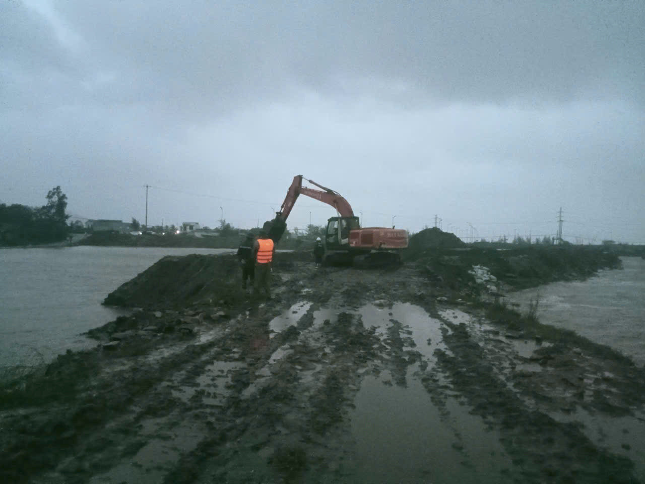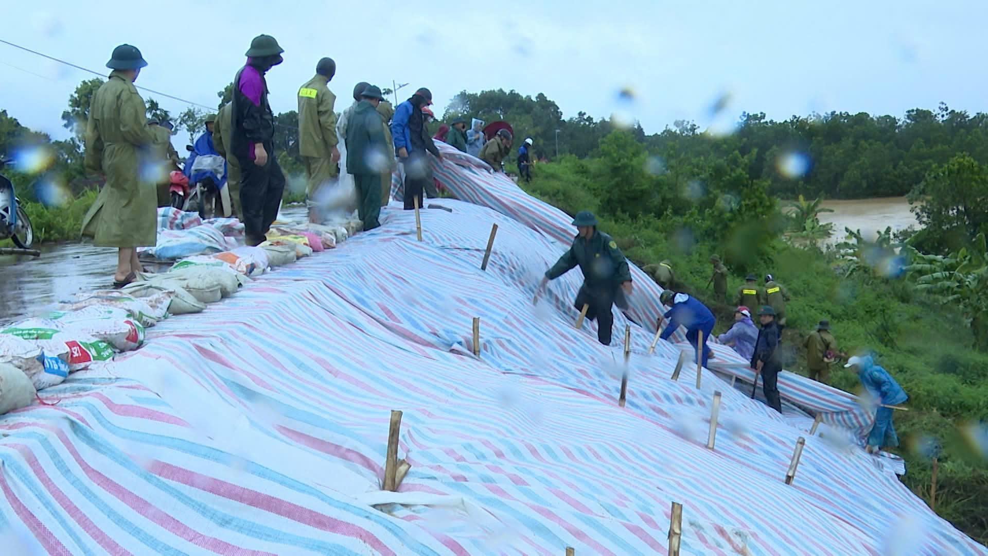 Tại xã Thọ Lập (Thanh Hóa) có mưa to, đoạn đê Trung ương từ Km 5+300 đến Km 6+300 xuất hiện sụt lún mái đê. Bí thư Đảng ủy xã Nguyễn Trường Sinh cho biết địa phương đã huy động nhân lực, vật tư, phương tiện gia cố cọc, phủ bạt che chắn, ngăn xói lở.