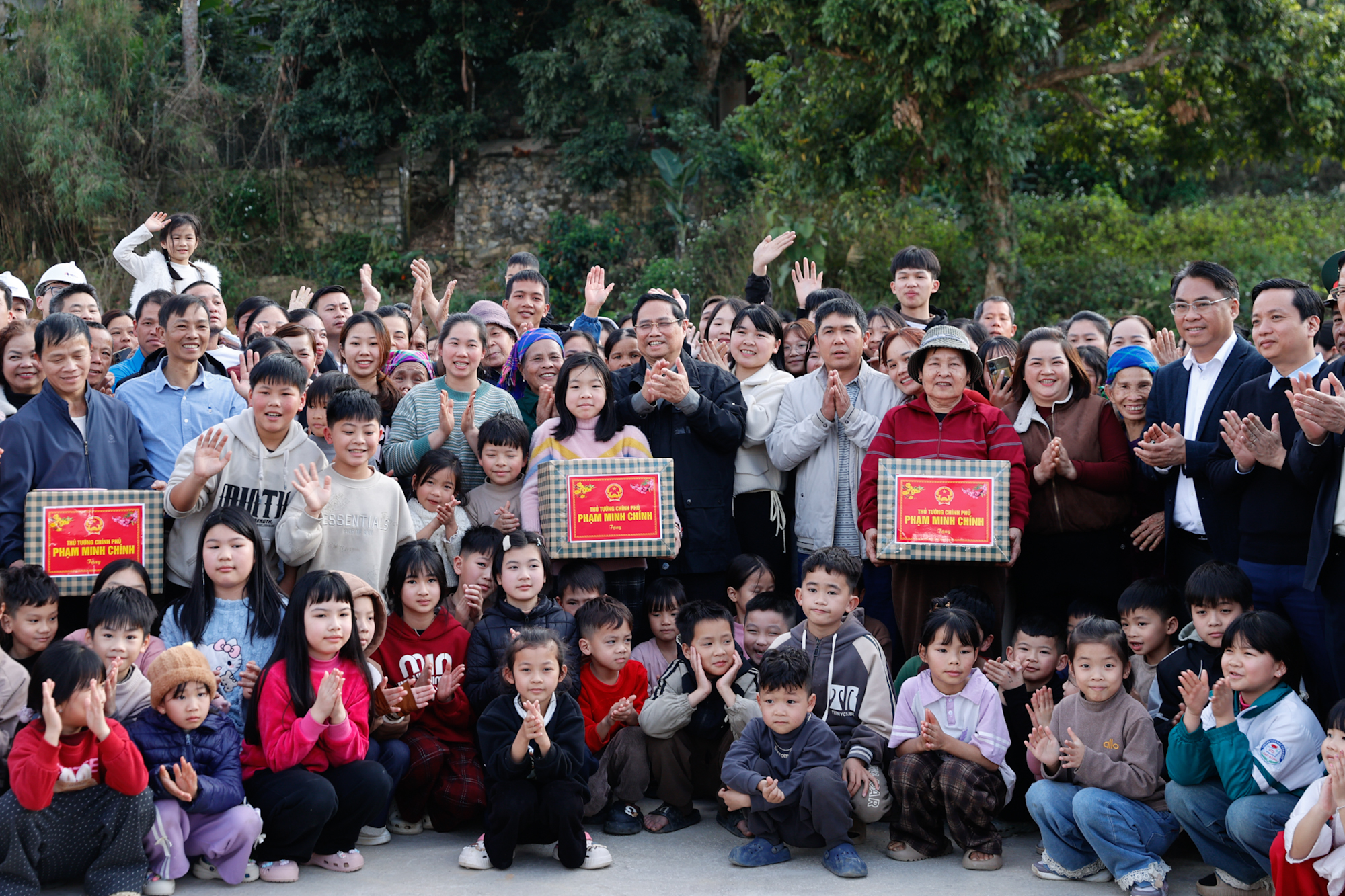 Thăm các gia đình trong khu tái định cư, cảm ơn bà con đã nhường đất cho dự án, Thủ tướng nêu rõ Đảng, Nhà nước không có mục tiêu nào khác là giữ độc lập, chủ quyền, toàn vẹn lãnh thổ, chăm lo hạnh phúc cho nhân dân; yêu cầu chính quyền rà soát bảo đảm bà con đến nơi ở mới có cuộc sống ít nhất bằng hoặc tốt hơn nơi ở cũ; quan tâm tạo sinh kế cho bà con nhân dân, nhất là đây là khu vực vùng sâu, vùng xa, có truyền thống cách mạng hào hùng, một lòng theo Đảng.