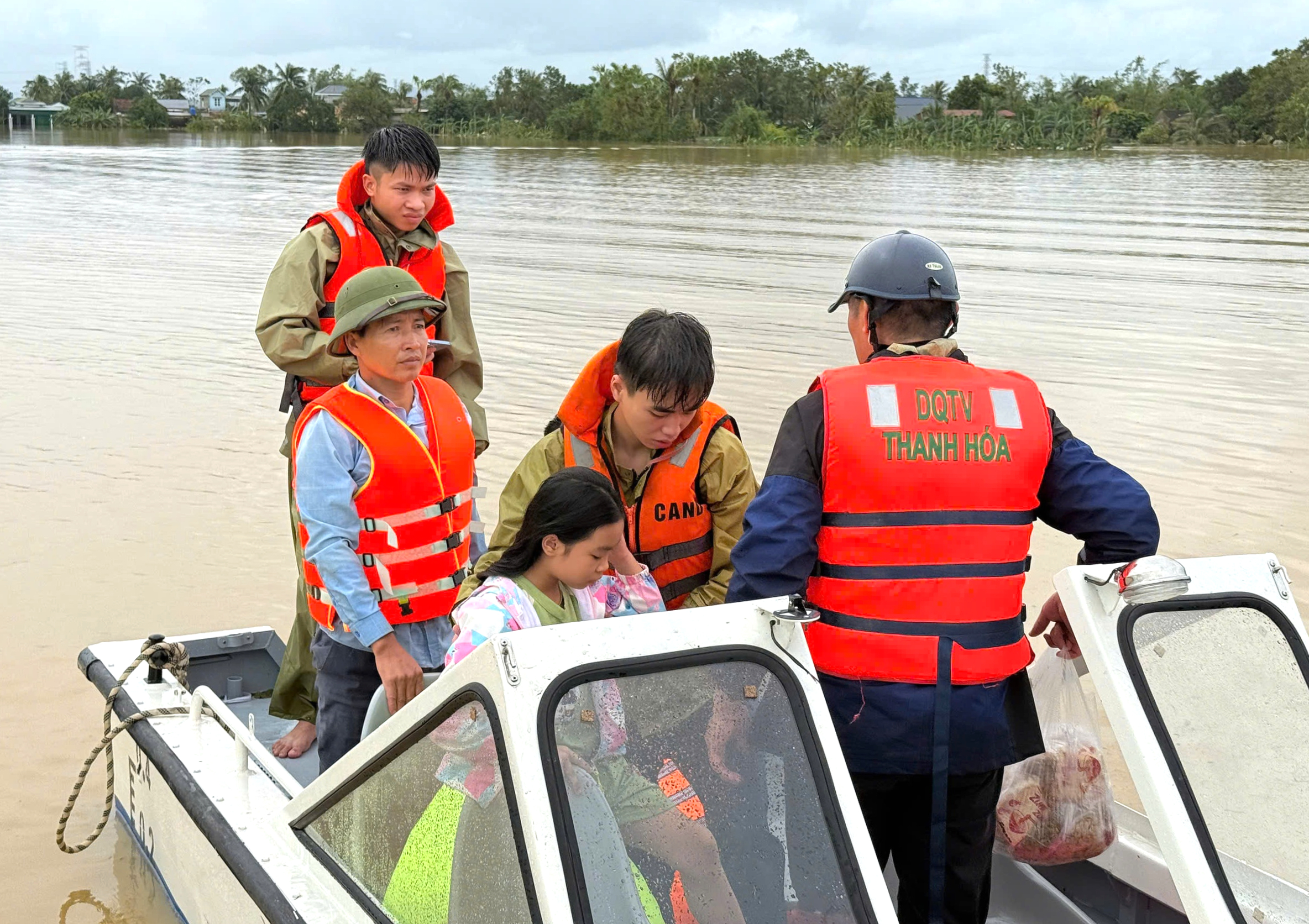 Chiều 29/9, khi nước lũ dâng cao, một số người dân xã Nông Cống dùng thuyền di chuyển ra ngoài, không may thuyền lật khiến 2 người tử vong và 1 người mất tích. Sáng 30/9, lực lượng chức năng tiếp tục tìm kiếm nạn nhân tại Làng Trù. (Ảnh: P. Tuấn)