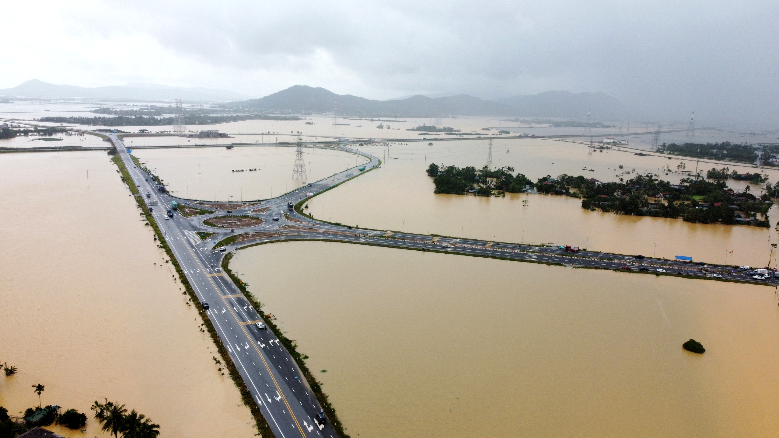 Nút giao cao tốc Vạn Thiện qua địa phận xã Nông Cống hiện bị nước lũ bao quanh. Các cánh đồng lúa, hoa màu xung quanh đều bị nhấn chìm. Thống kê sơ bộ cho thấy toàn xã có khoảng 250ha hoa màu bị ngập, 69ha thủy sản bị tràn, nhiều cây xanh ngã đổ. (Ảnh: P. Tuấn).
