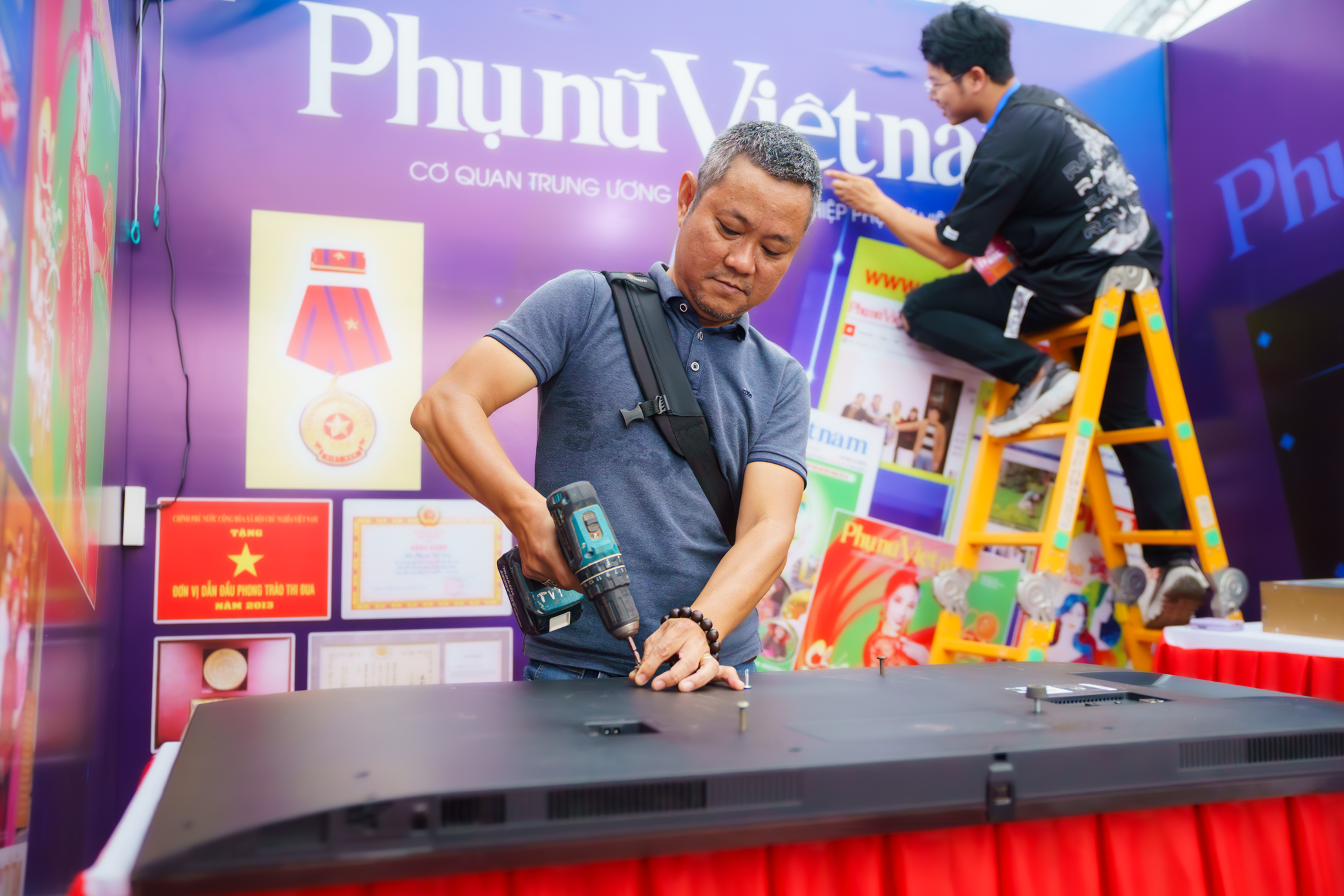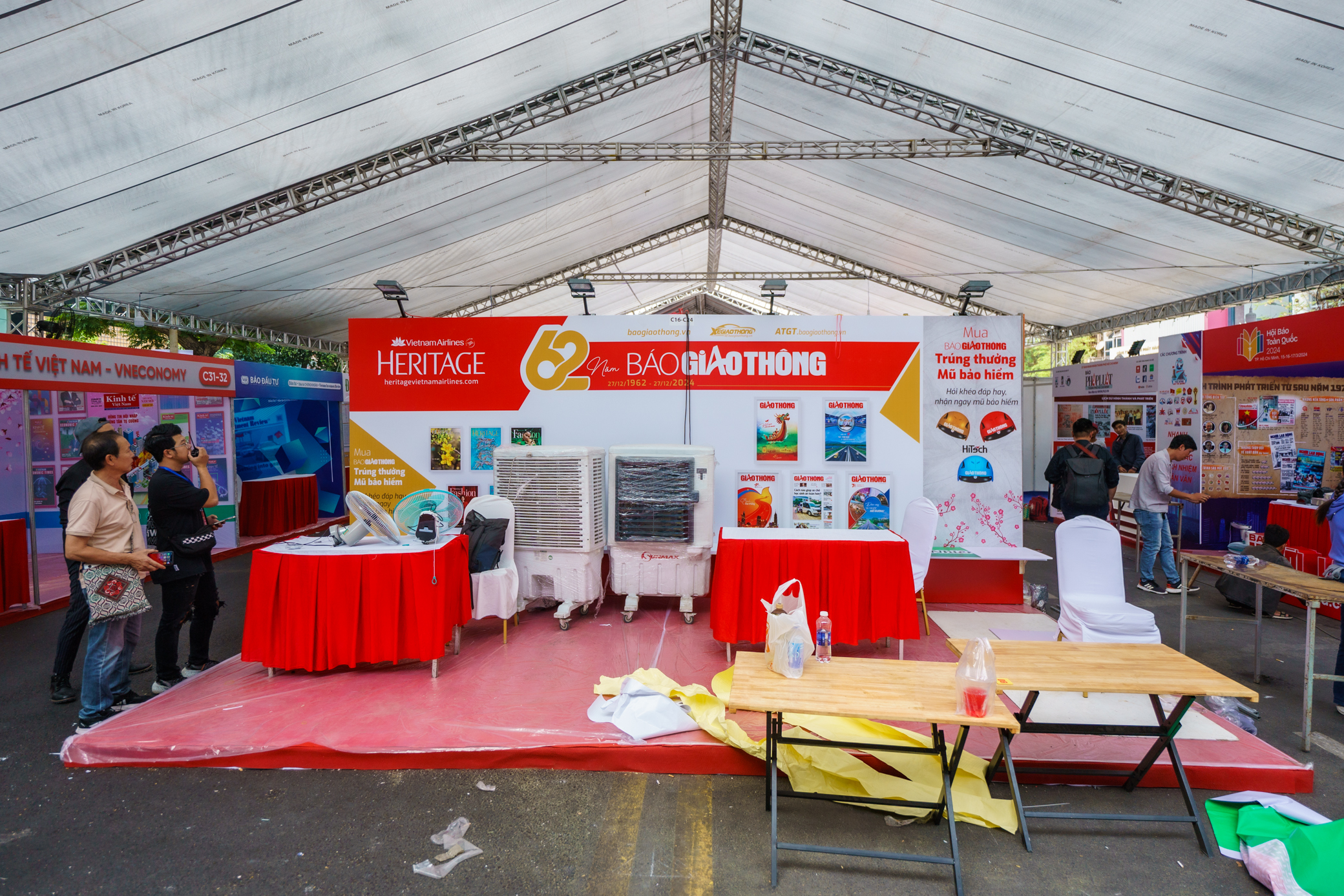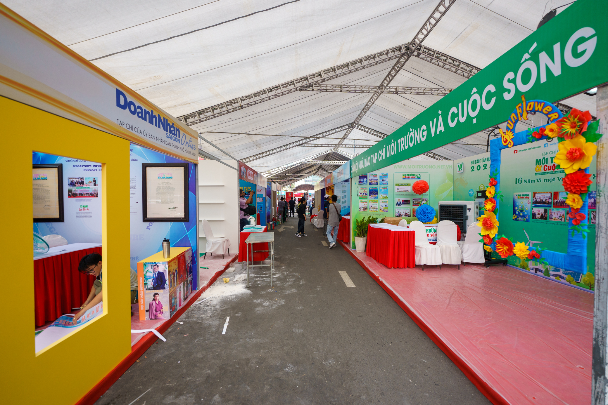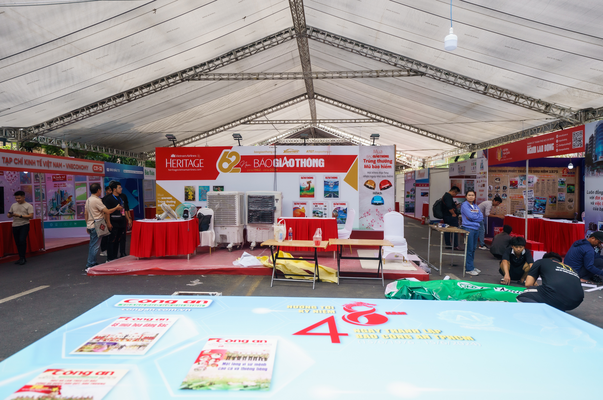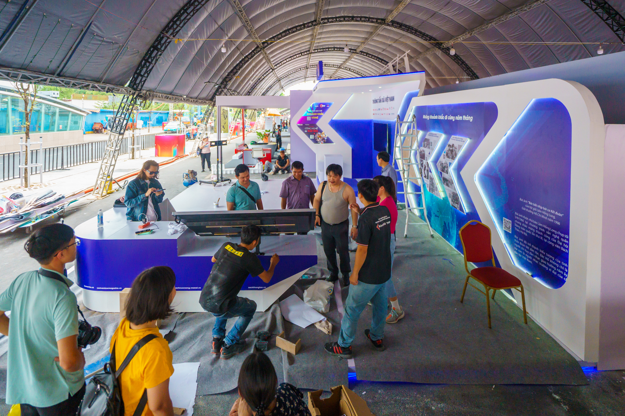 Khu vực tổ chức hội báo đã được dựng rạp. Các đơn vị đang tất bật trang trí, hoàn tất gian hàng trưng bày.
