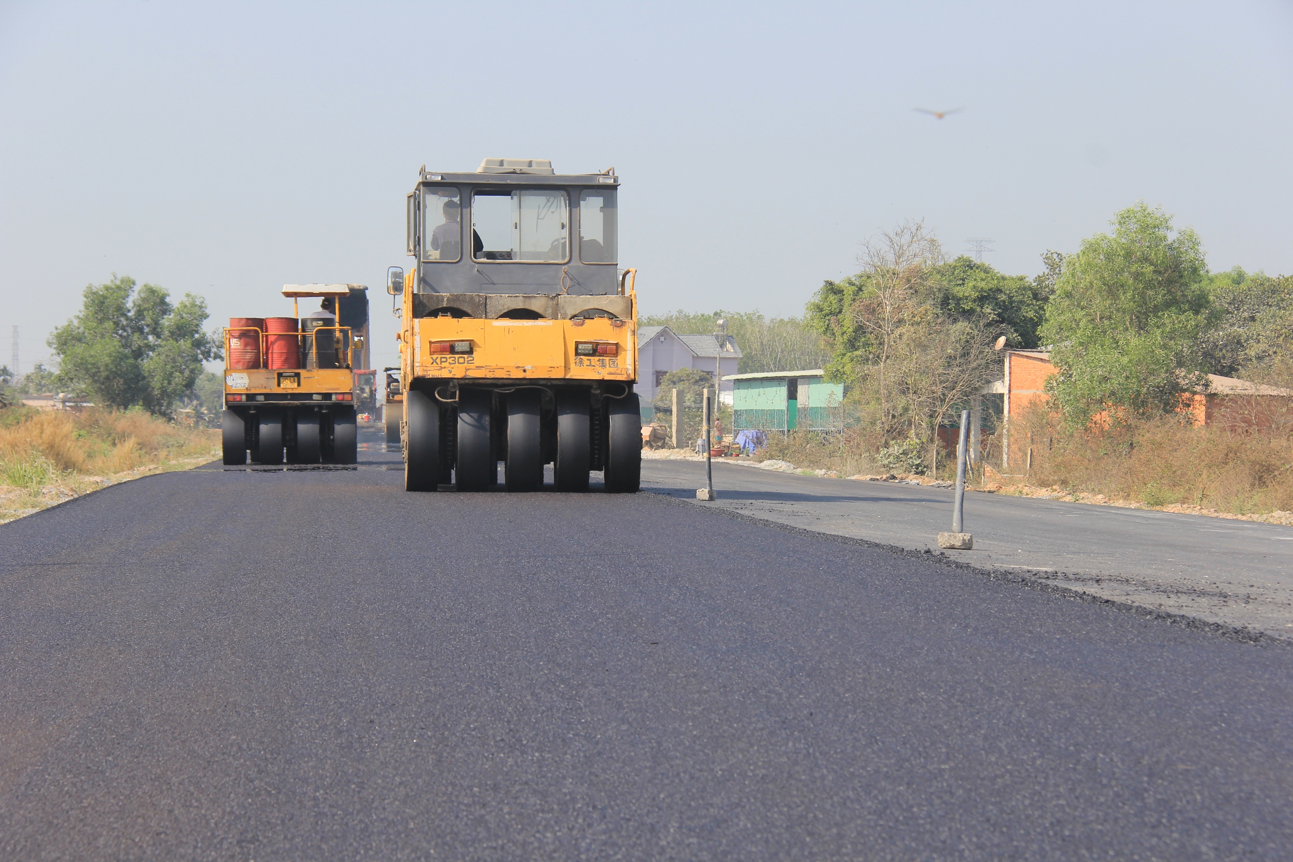 Trên công trường gói thầu XL03, không khí thi công rất khẩn trương, tại Km76 qua xã Hậu Nghĩa (tỉnh Tây Ninh) hàng chục công nhân cùng xe cơ giới đội nắng thi công thảm nhựa mặt đường.