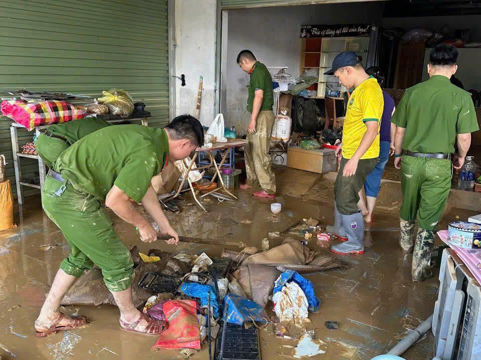 Lực lượng công an tỉnh trực tiếp giúp đỡ các hộ dân thu dọn, vệ sinh sau lũ.