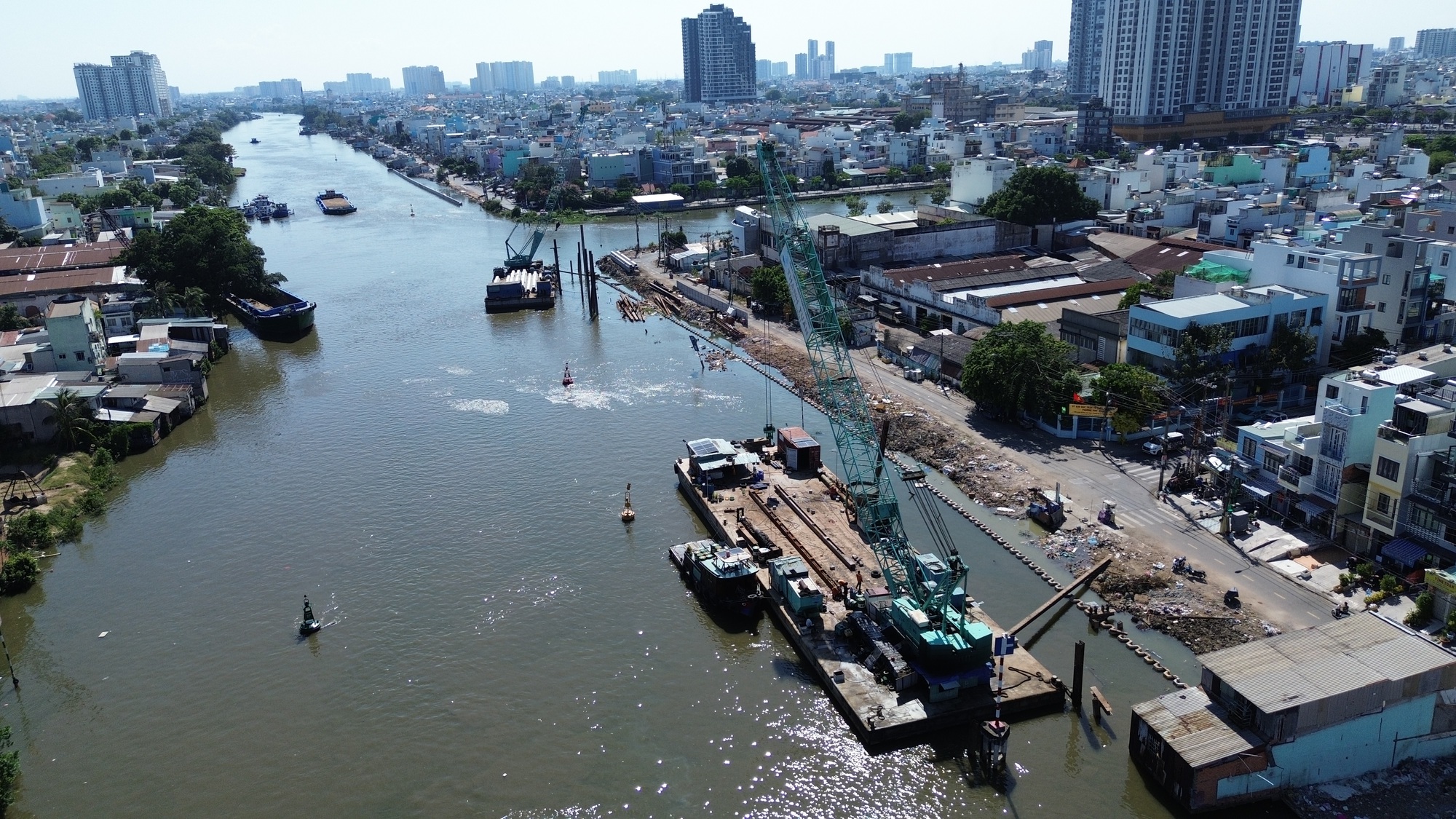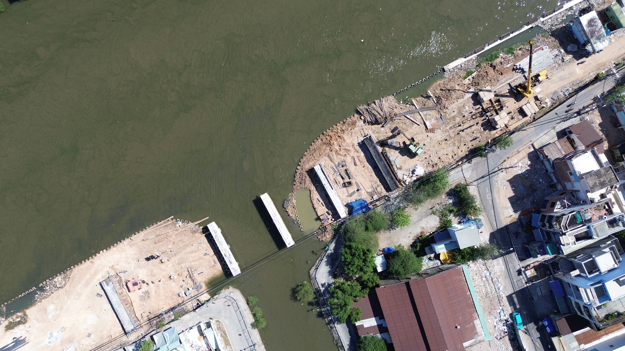 Trên tuyến, nhiều đoạn đã được nhà thầu đưa máy móc, thiết bị vào thi công. Một số vị trí đang triển khai đóng cọc, làm kè, xử lý nền và thi công hệ thống hạ tầng kỹ thuật. Tuy nhiên, việc thi công chưa thể triển khai đồng loạt trên toàn tuyến do vẫn còn vướng mặt bằng cục bộ.