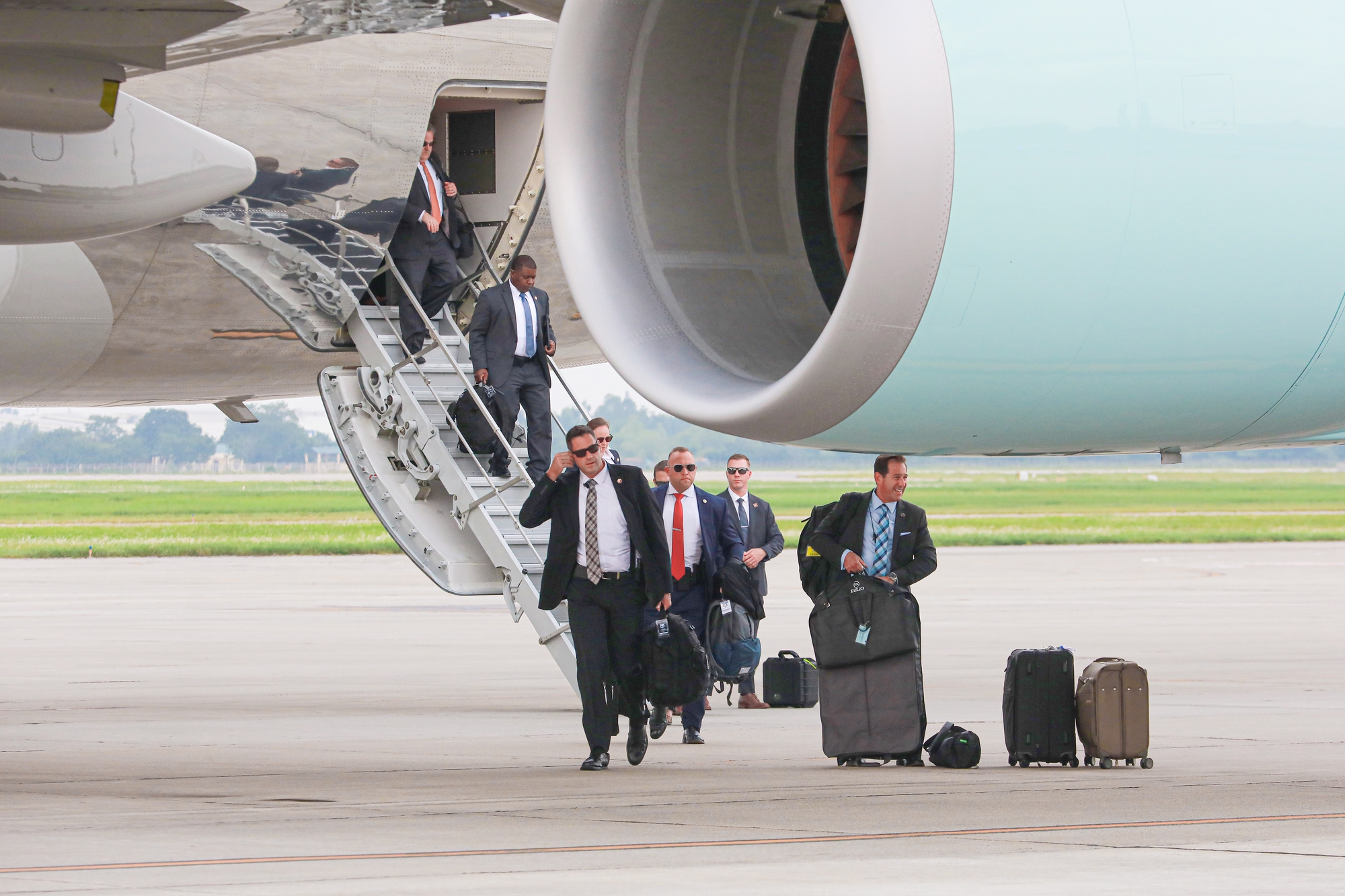 Đoàn hộ tống Tổng thống Hoa Kỳ từ chuyên cơ di chuyển xuống sân bay.
