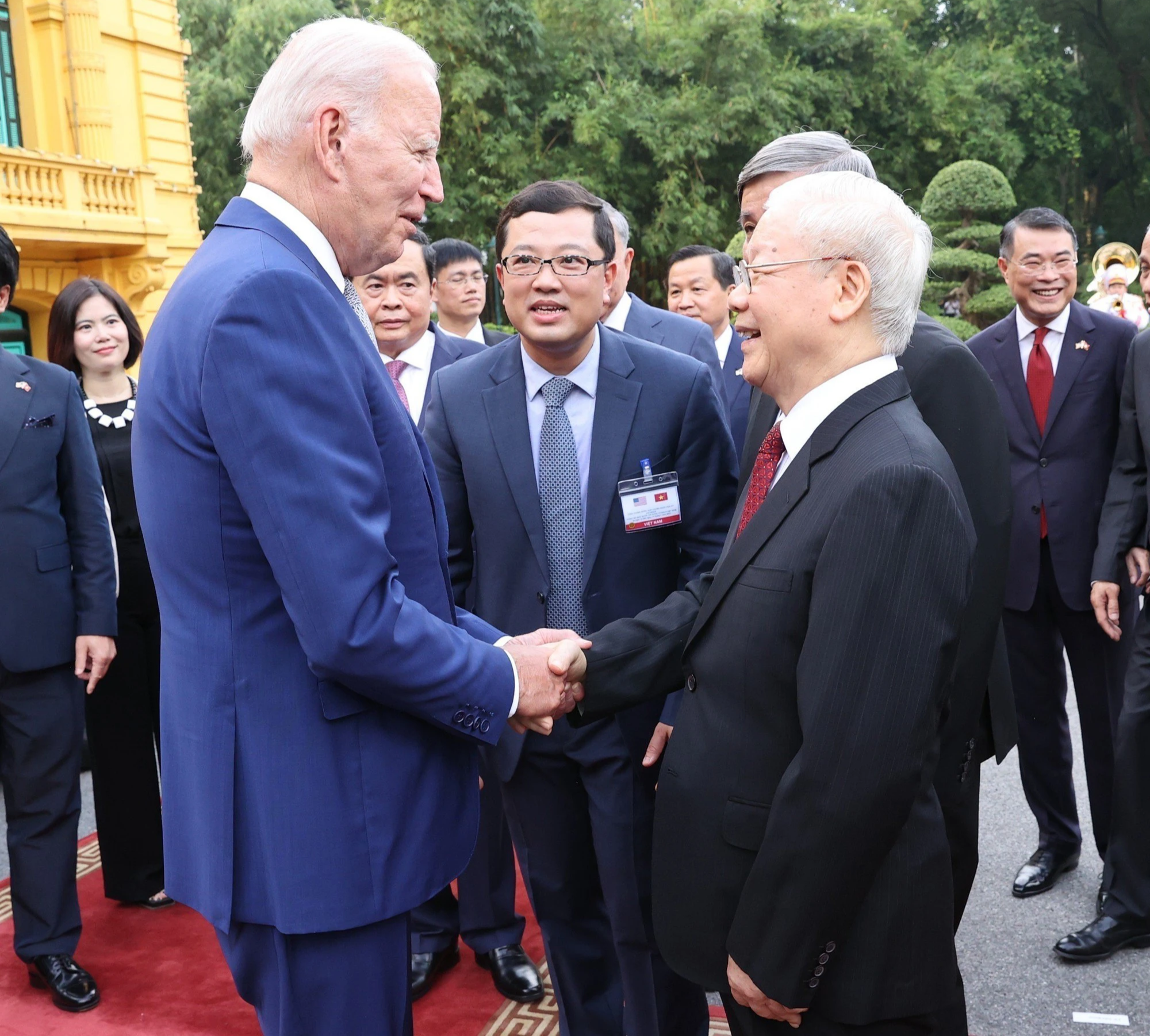 Tổng bí thư Nguyễn Phú Trọng chào đón Tổng thống Joe Biden. Ảnh: TTXVN.
