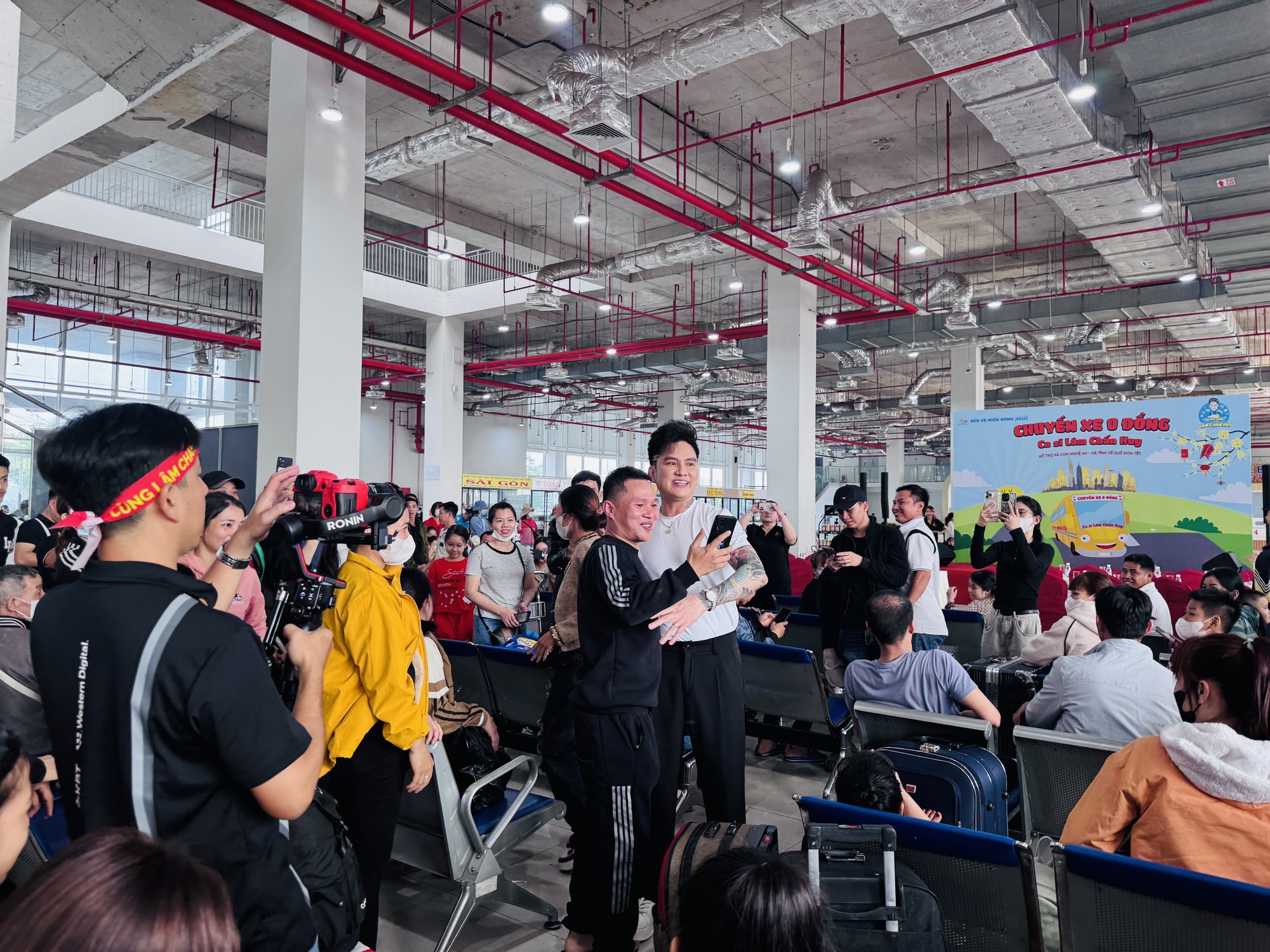 Trong sáng 24/1, Bến xe Miền Đông mới trở nên rộn ràng hơn khi đơn vị này phối hợp với Công ty Cổ phần LCH Foods (ca sĩ Lâm Chấn Huy) tổ chức chuyến xe 0 đồng, đưa 440 người dân khó khăn về Nghệ An, Hà Tĩnh đón Tết. Trong ảnh, ca sỹ Lâm Chấn Huy giao lưu cùng người dân trước giờ xe xuất bến.