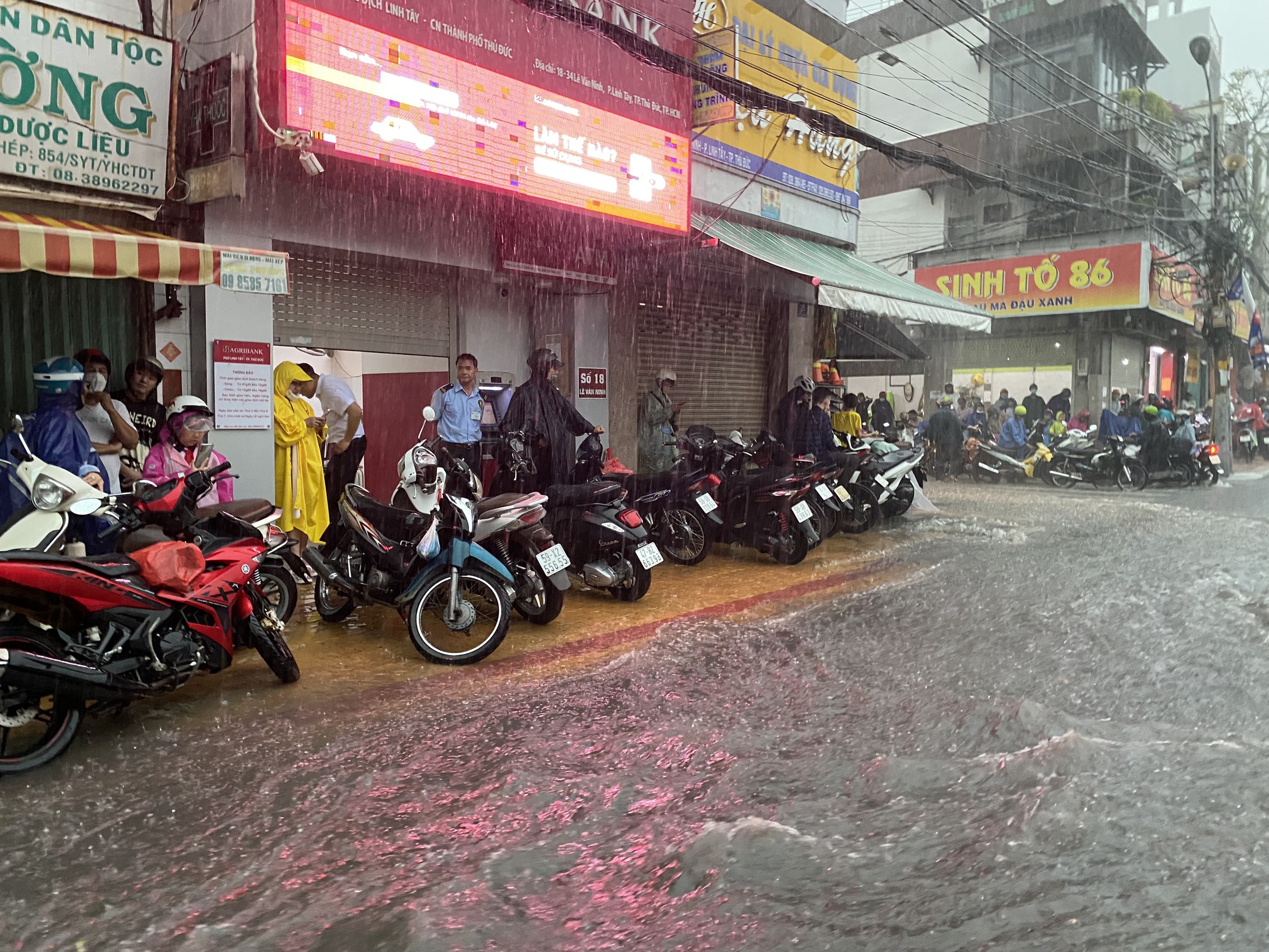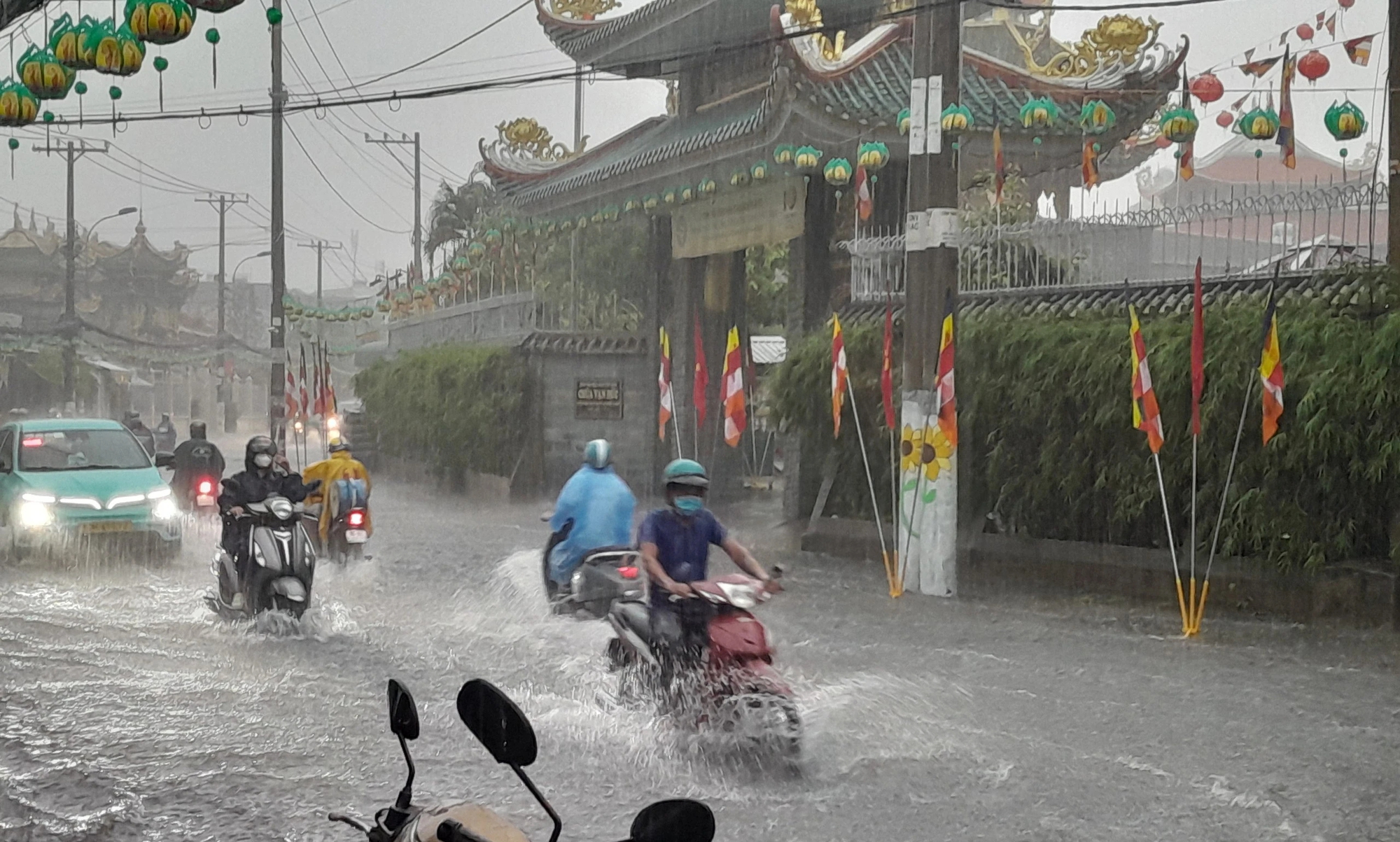 Trong đó, khu vực TP Thủ Đức bị ngập rất nặng sau khi mưa khoảng 15 phút. Trong ảnh, người dân chạy xe qua dòng nước mưa trên đường Kha Vạn Cân, TP Thủ Đức.