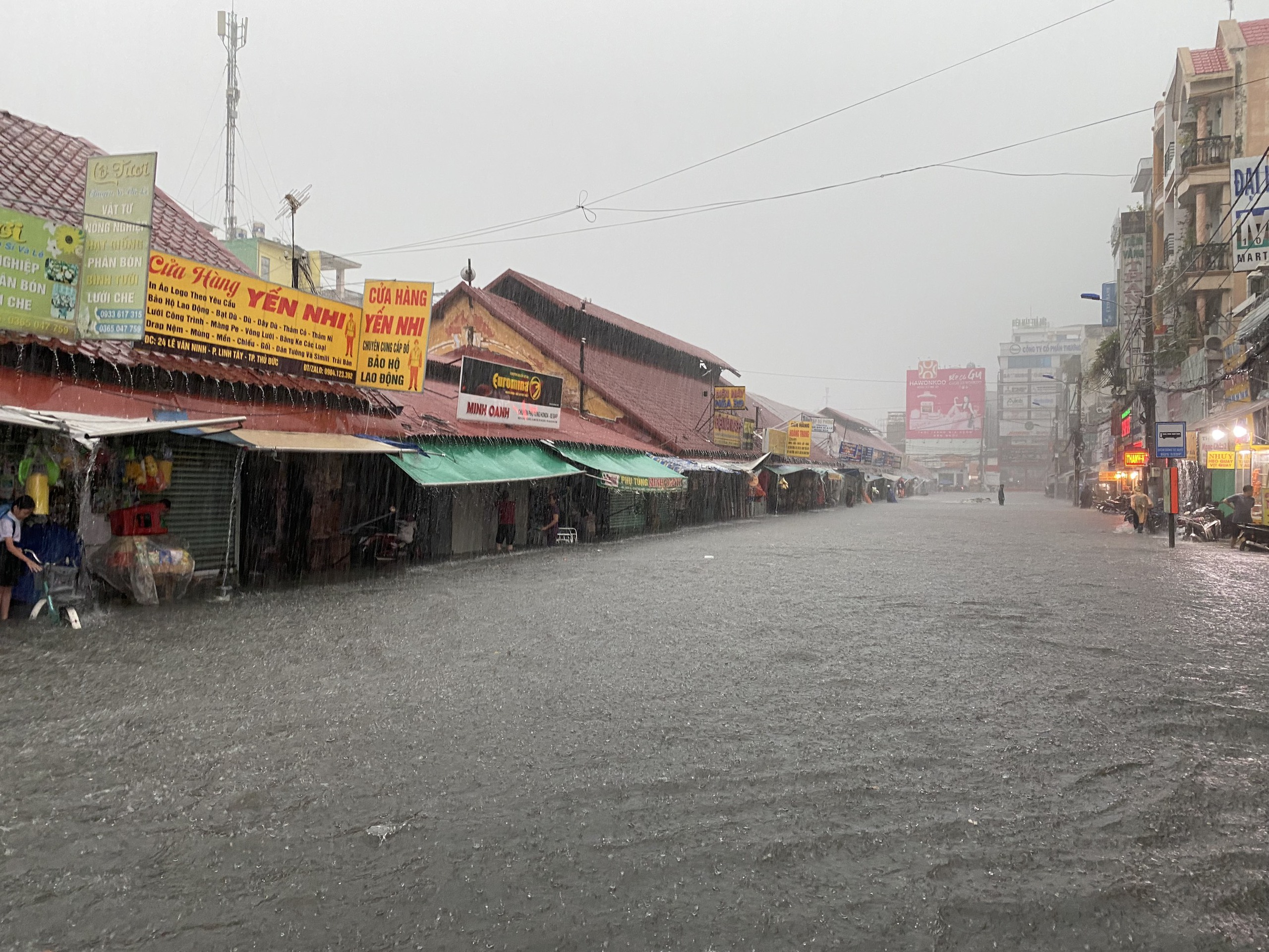 Đặc biệt nhất là các đường xung quanh chợ Thủ Đức như Hồ Văn Tư, Kha Vạn Cân, Tô Ngọc Vân, Dương Văn Cam... xảy ra tình trạng ngập nặng. Trong ảnh, nước mưa ngập như sông trước chợ Thủ Đức.