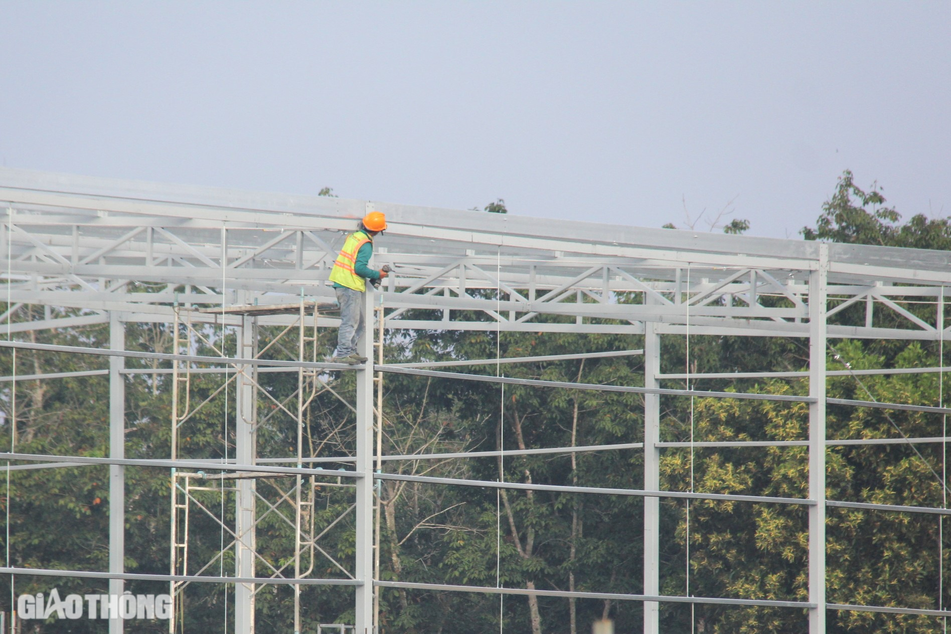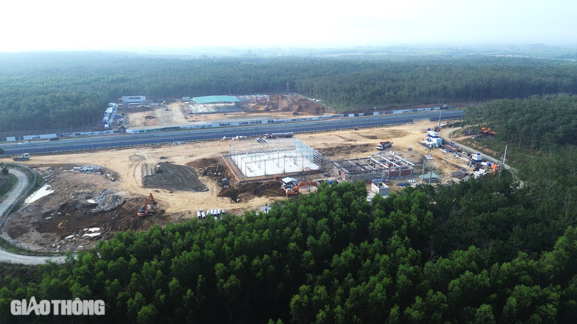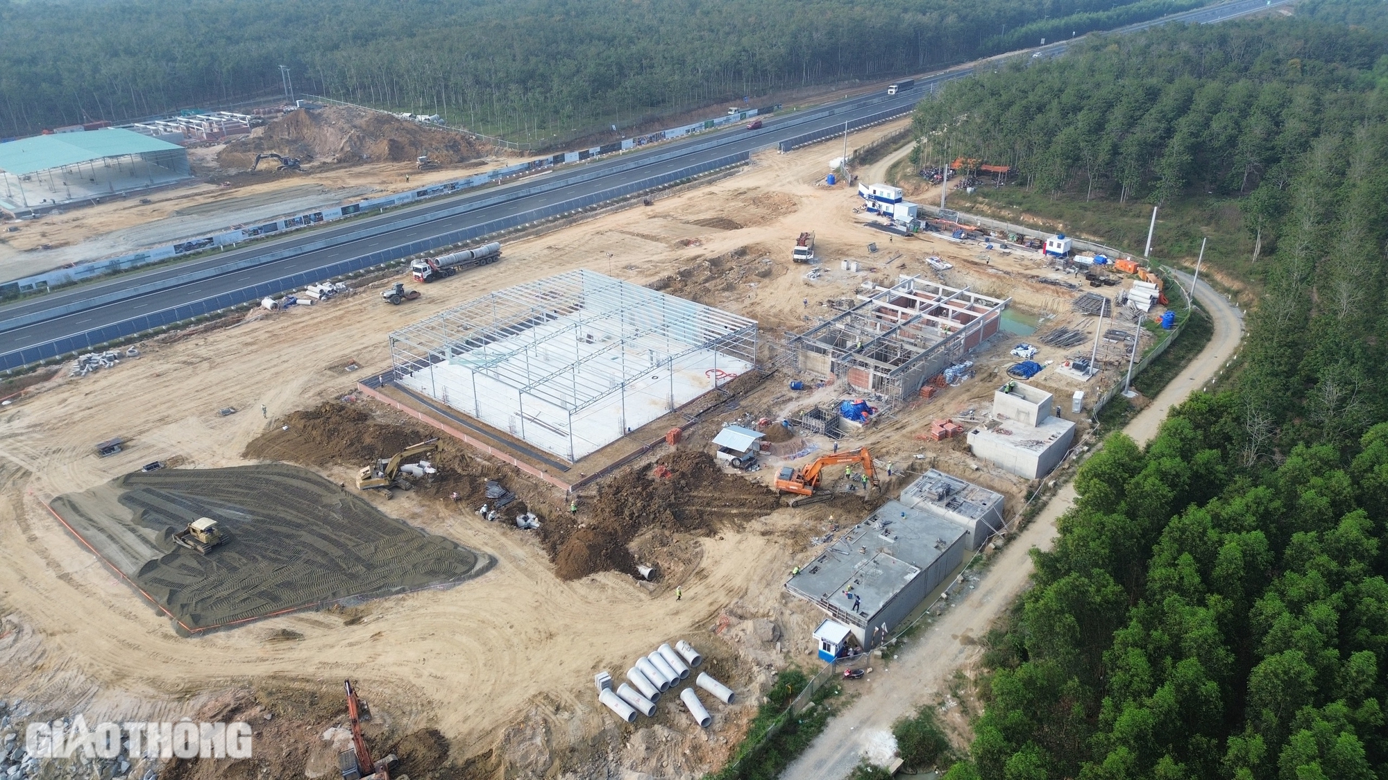 Tại trạm dừng nghỉ bên phải tuyến (hướng Phan Thiết - Đồng Nai), nhà thầu đang tăng tốc xây lắp các giàn thép khu gian trạm dừng, hệ thống điện nước, chiếu sáng.