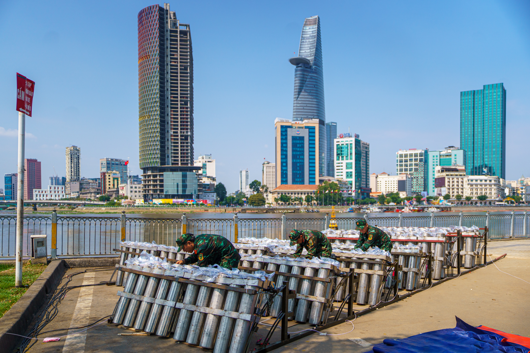 Sáng 9/2 (30 tháng Chạp) tại công viên hầm vượt sông Sài Gòn (TP Thủ Đức), 1.500 quả pháo tầm cao cùng 30 giàn pháo hoa tầm thấp đã được mang ra để dựng trận địa. Đây là khu vực tập kết nhiều giàn pháo hoa nhất trong các điểm bắn của thành phố.