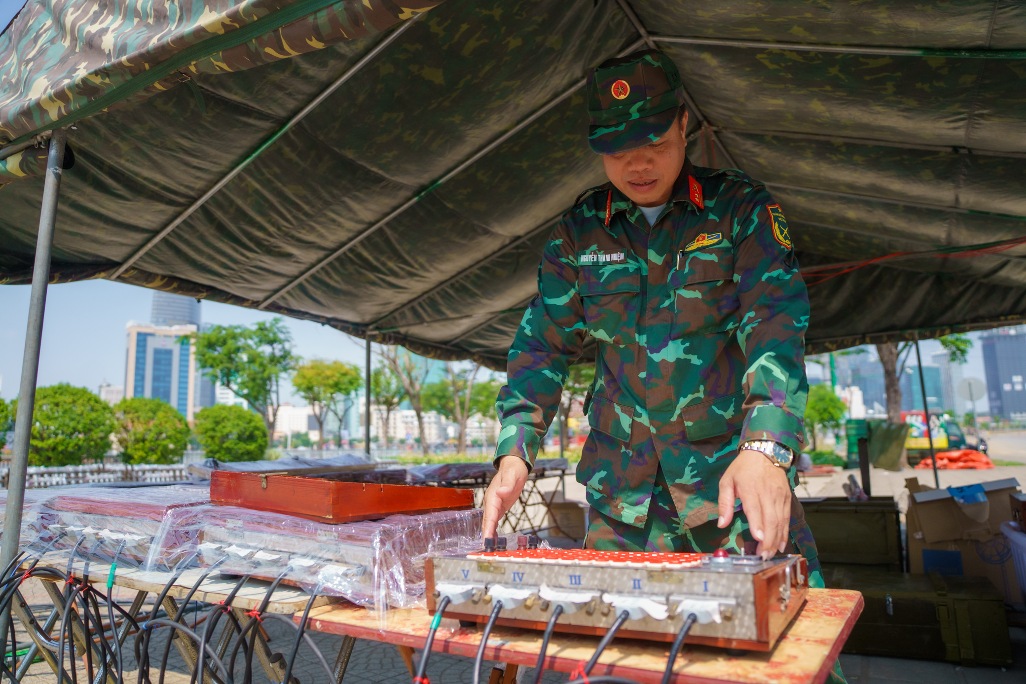 Tại dàn pháo tầm cao, Thiếu tá Thân Trọng Duy, thuộc phòng Kỹ thuật Quân sự - Bộ Tư lệnh TP.HCM đang cùng đồng đội đấu nối dây mồi lửa điện. "Đây là năm đầu tiên tôi tham gia lắp đặt trận địa pháo hoa rồi sau đó trực đến giao thừa. Công việc này cần chuyên môn cao, nên đôi lúc anh em rất căng thẳng nhưng vẫn vui vì giúp người dân được ngắm pháo hoa dịp Tết", Thiếu tá Duy chia sẻ thêm.