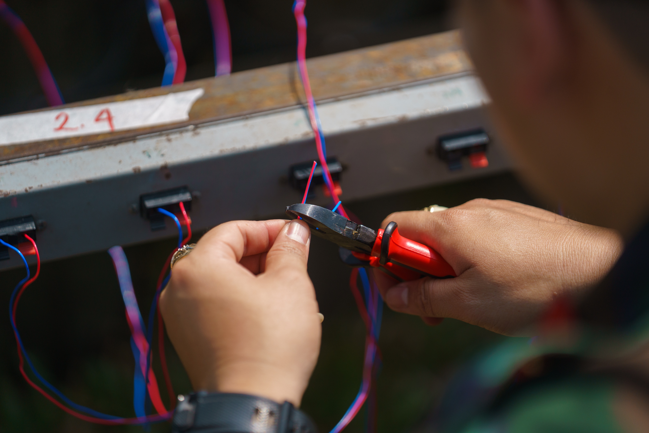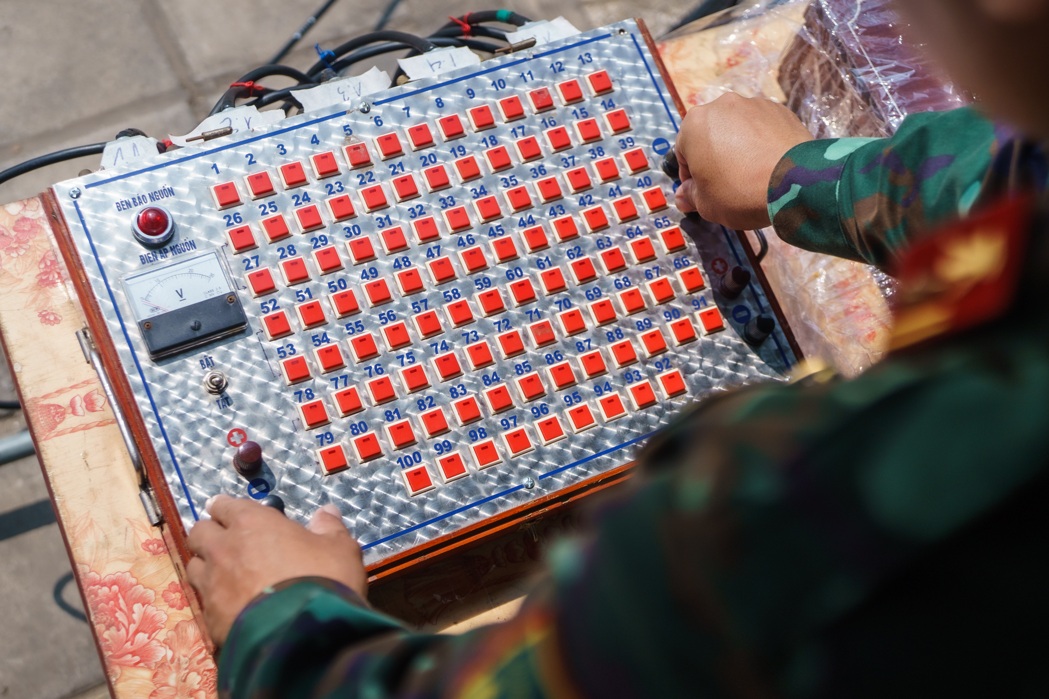 Sau khi cho pháo tầm cao vào ống, những dây mồi lửa điện được đấu nối với thanh điều khiển. Công việc này là một trong những khâu cuối cùng khi lắp pháo hoa.