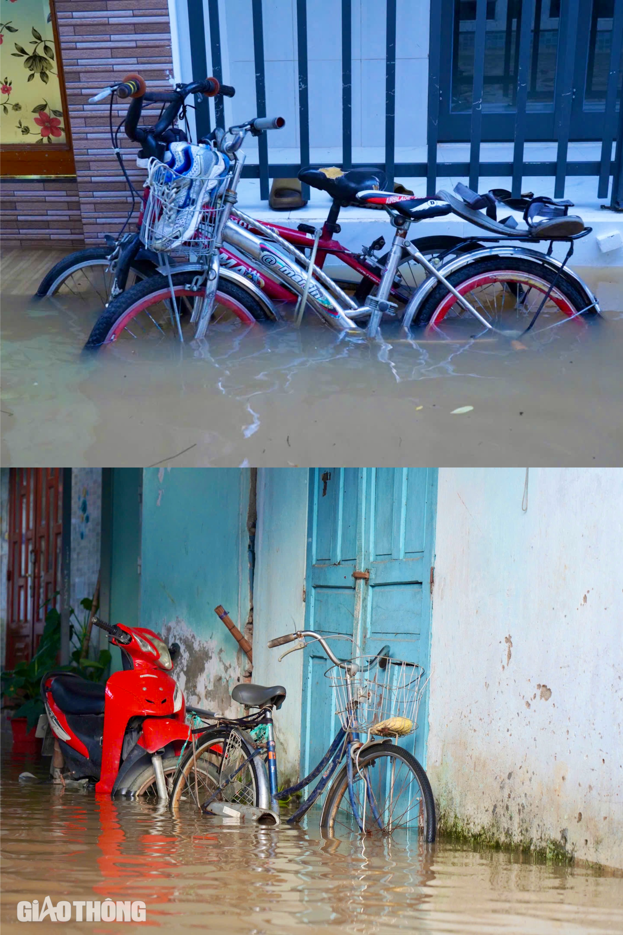 Nhiều ngôi nhà bị chìm sâu trong biển nước, người dân phải ở trong nhà để chờ nước rút.