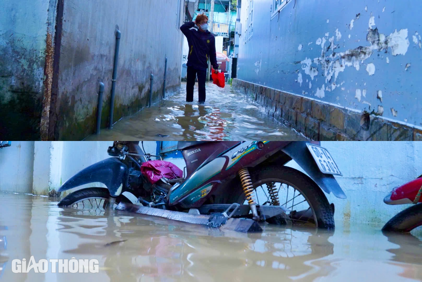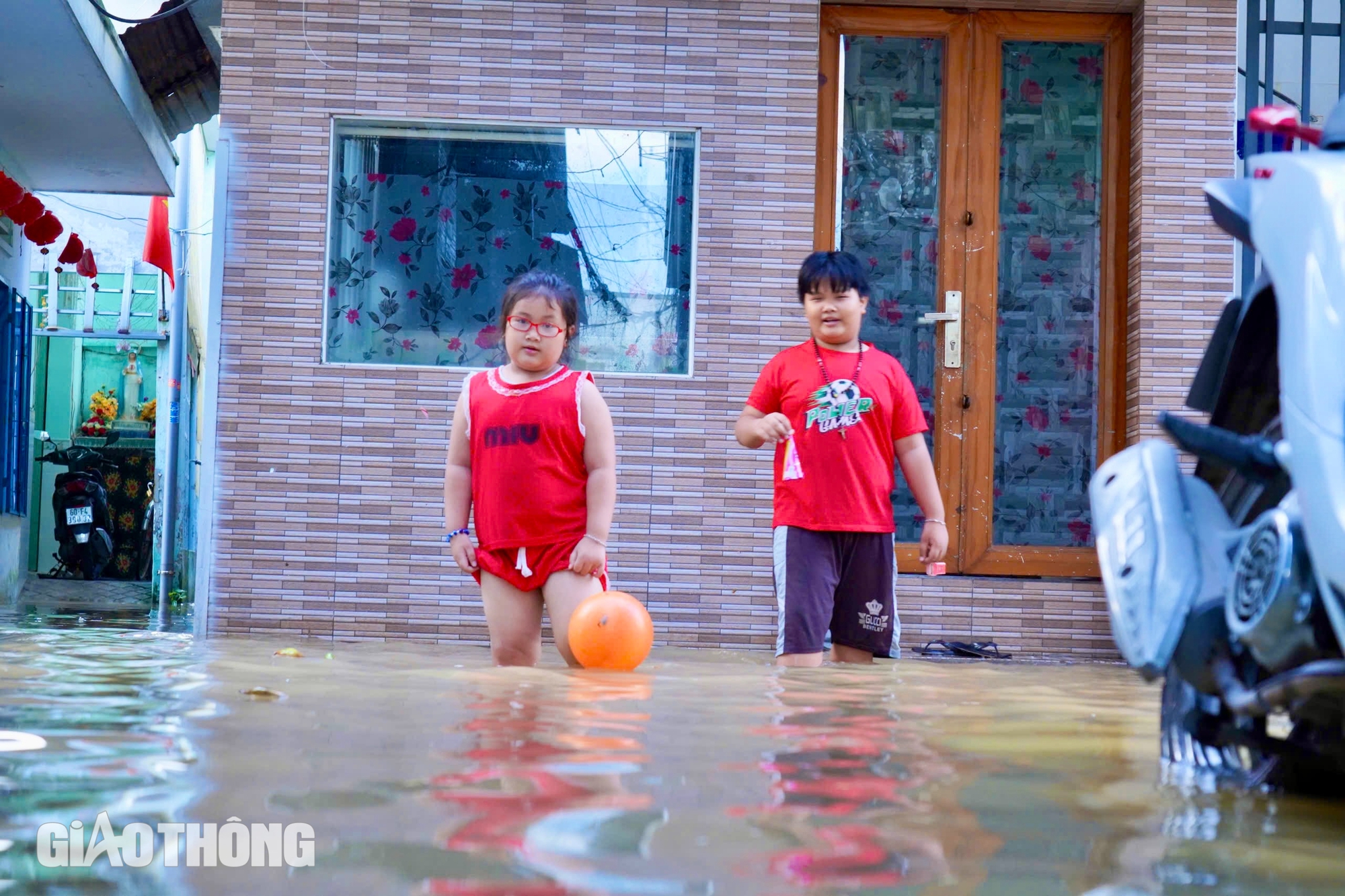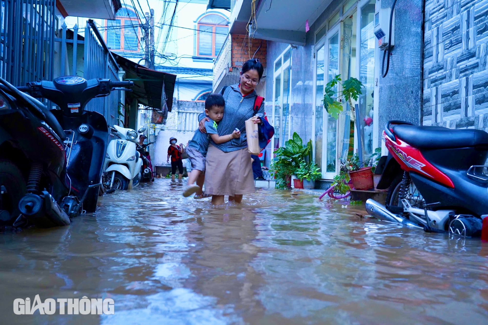 Một số vị trí nước quá gối, ngập nửa xe máy nhưng người dân vẫn vui vẻ xem như chuyện thường xảy ra mỗi đợt triều cường lên.