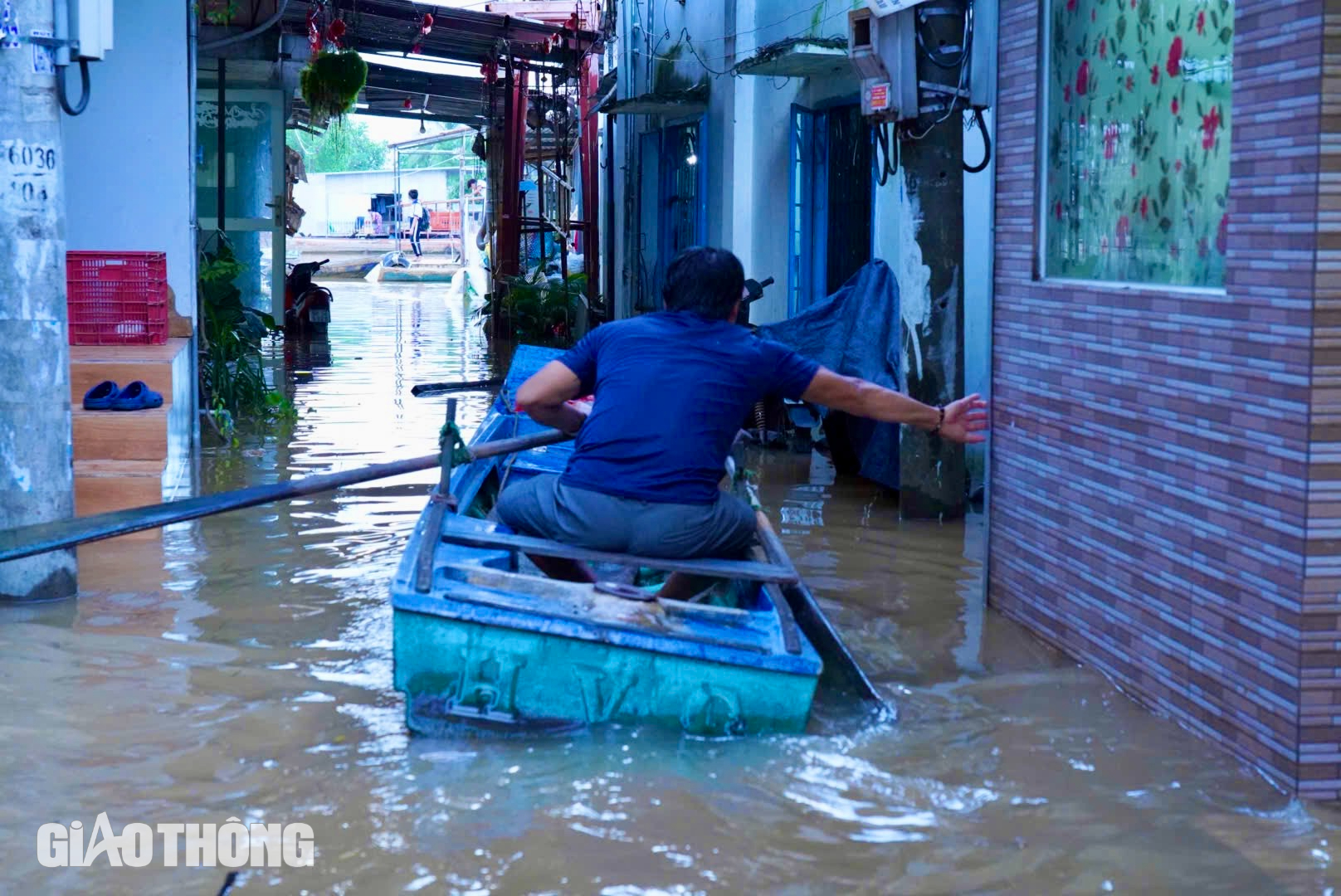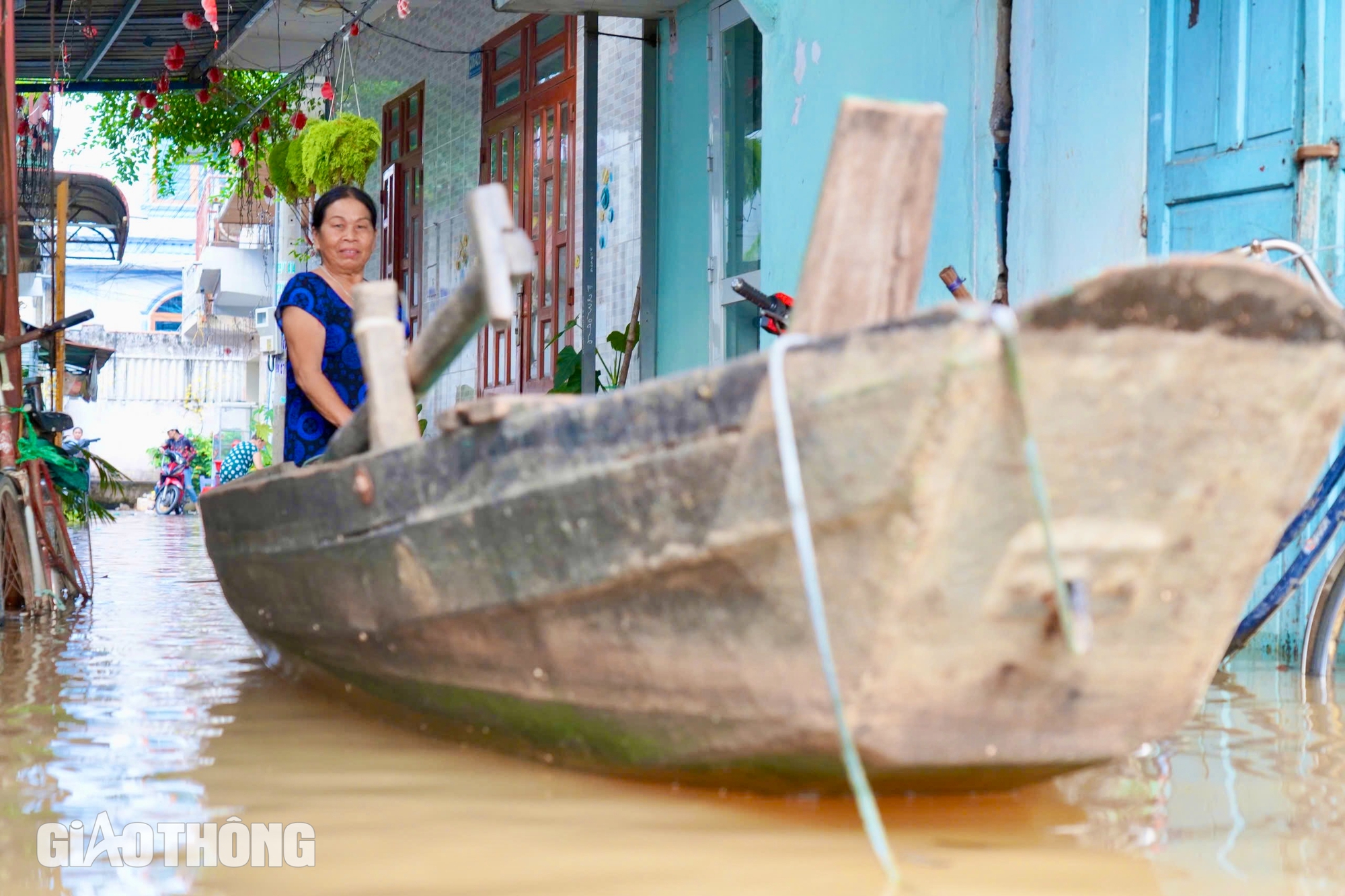 Một số người dân phải chèo ghe để đi lại vì không thể lội nước do nhiều đoạn ngập sâu.
