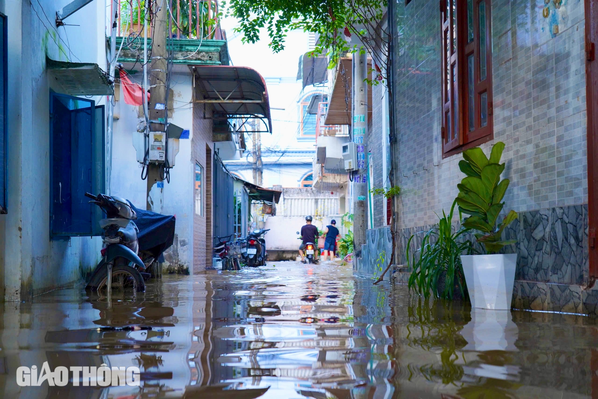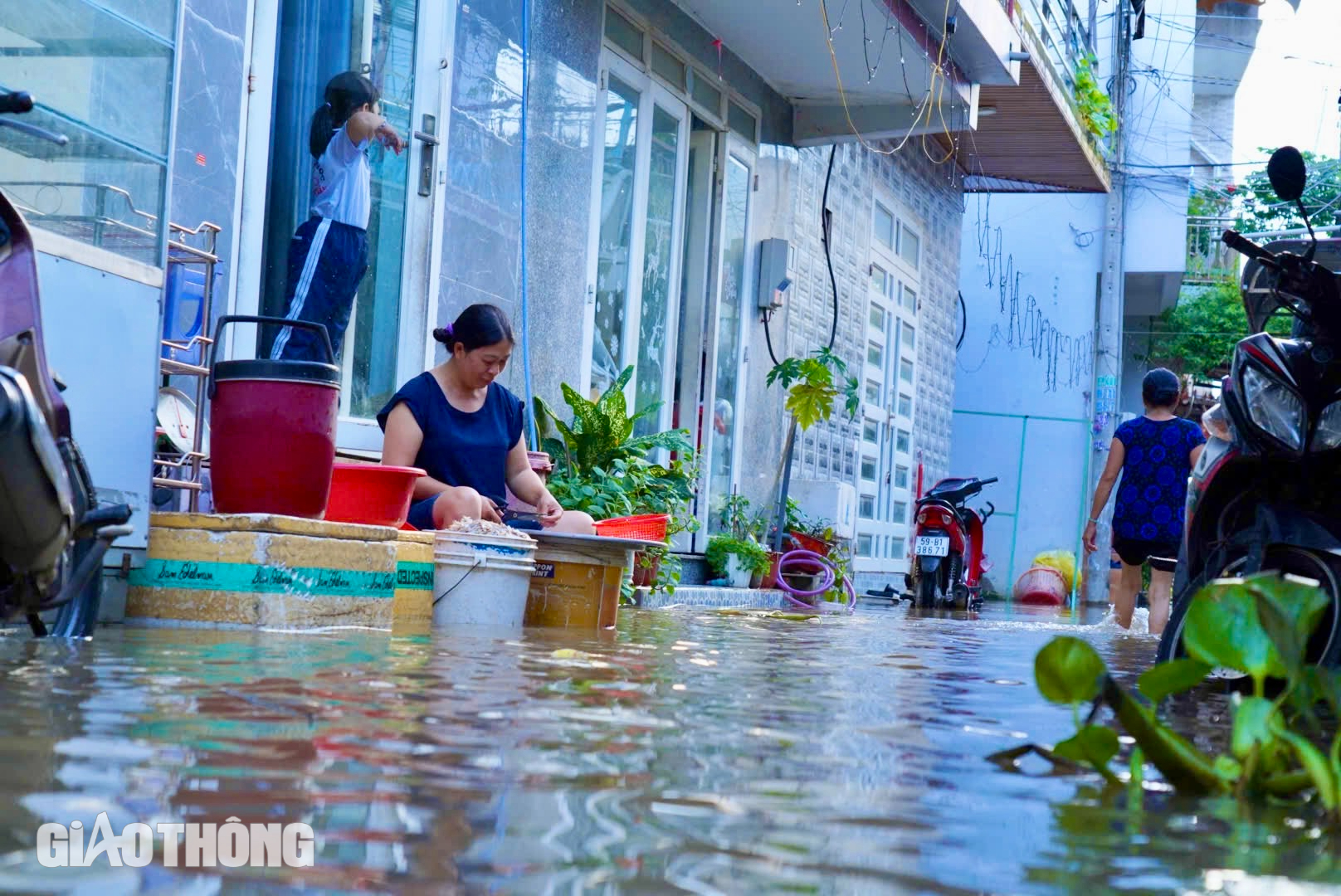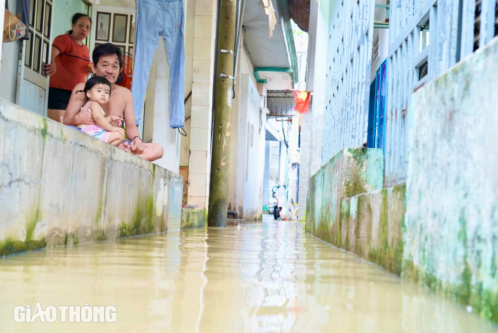 Một số gia đình nhờ nhà xây cao nên nước chỉ vào đến con hẻm, không ngập đến nền nhà.
