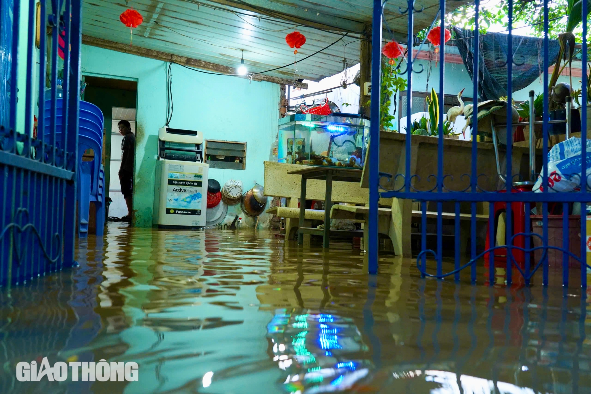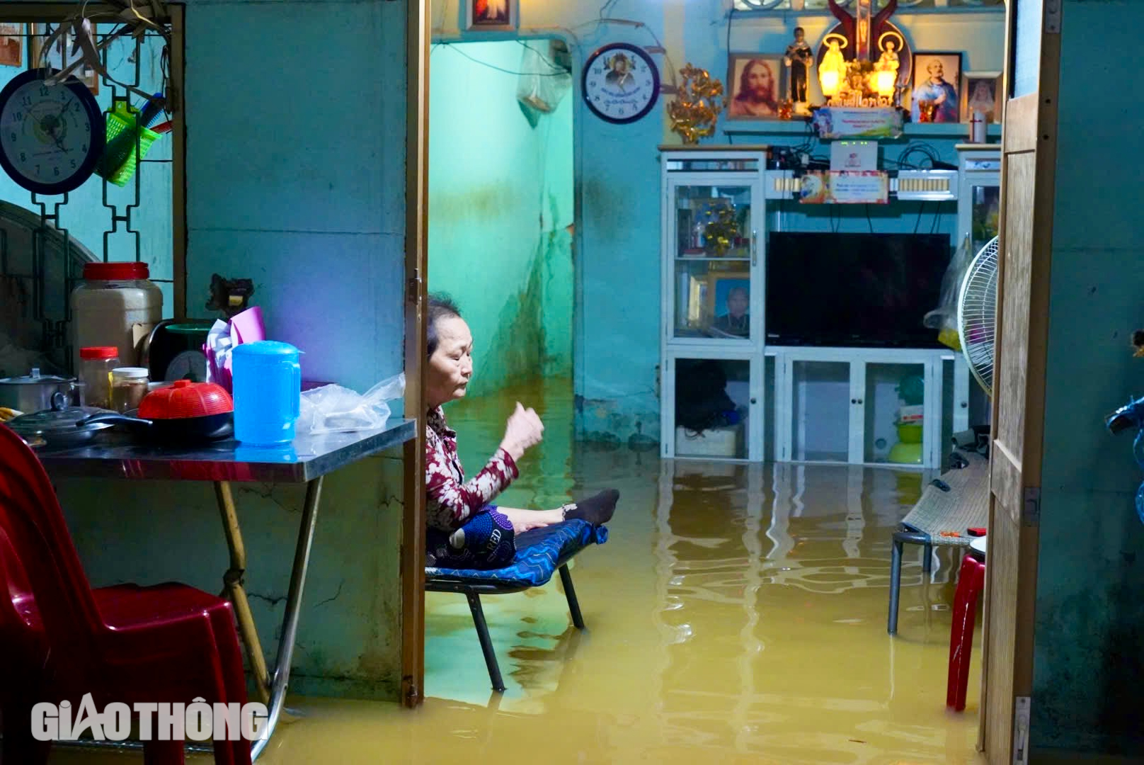 Bà Năm (khu phố Thái Hòa, Phường Long Bình Tân) buồn rầu nhìn dòng nước tràn vào nhà. Bà Năm cho biết chỉ kịp kê cao đồ đạc rồi ngồi thảnh thơi chờ nước rút. "Quen rồi, nhưng năm nay nước dâng mạnh hơn", bà Năm nói.
