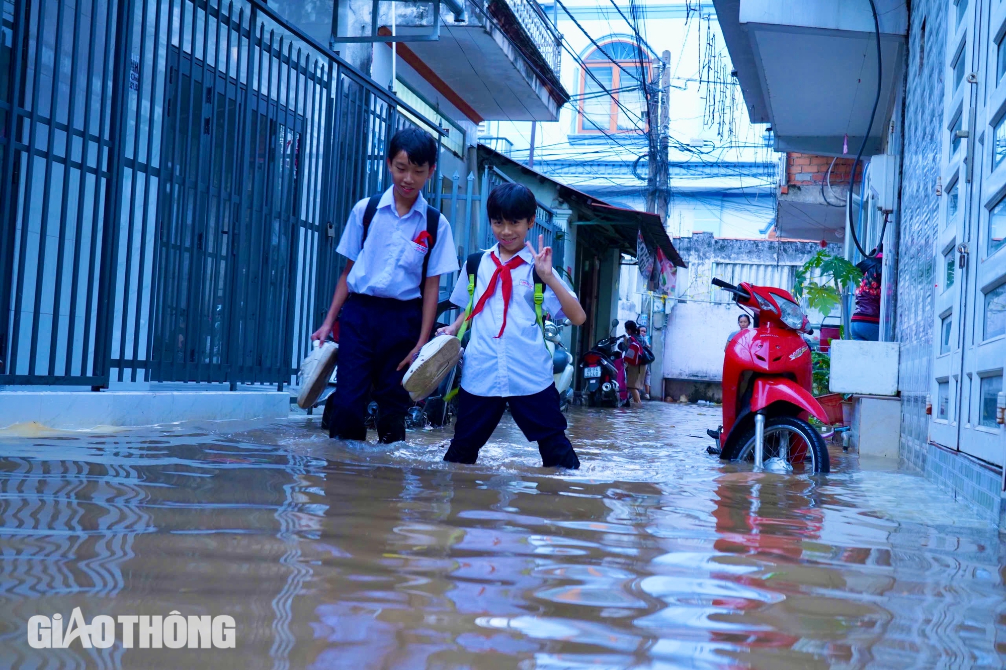 Một số em học sinh sau giờ tan trường đã phải lội nước trở về nhà.