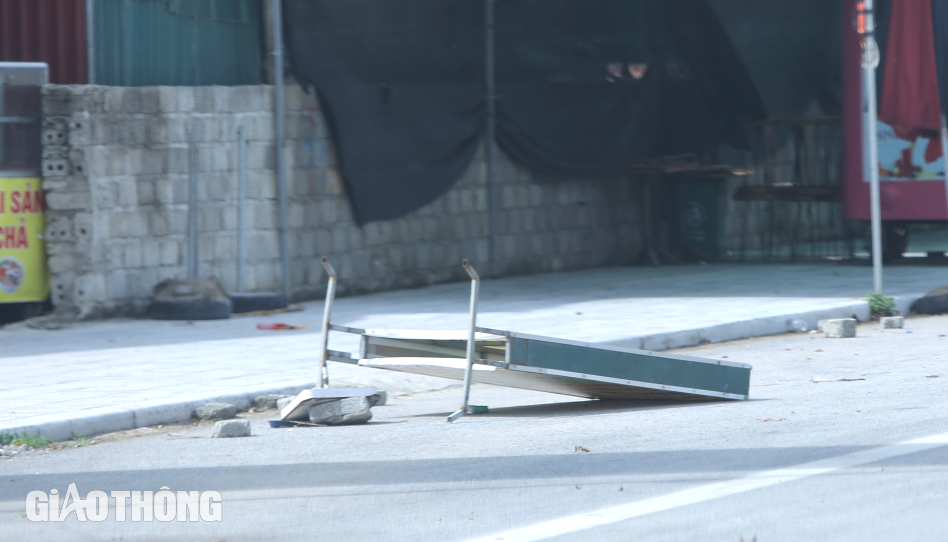 Một tấm biển quảng cáo bị gió xô đổ khi để dưới lòng đường cũng không được chủ quán dựng lại.
