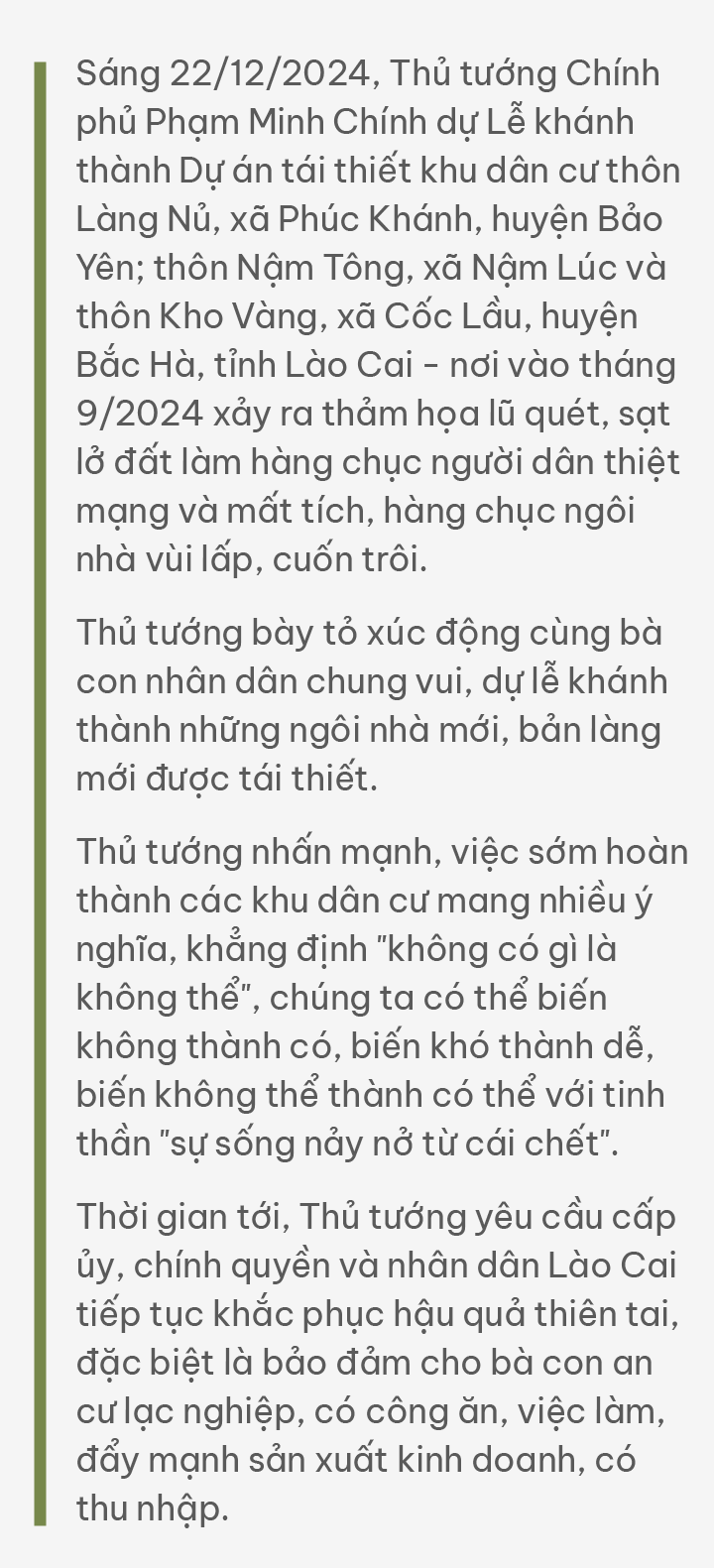 Nhìn bà con phấn khởi, ai cũng vui lây. Đến nay, 100% hộ dân Làng Nủ có nhà bị lũ cuốn trôi, sập đổ hoàn toàn, nằm trong khu vực nguy cơ sạt lở đều đã có nơi ở ổn định, an toàn.