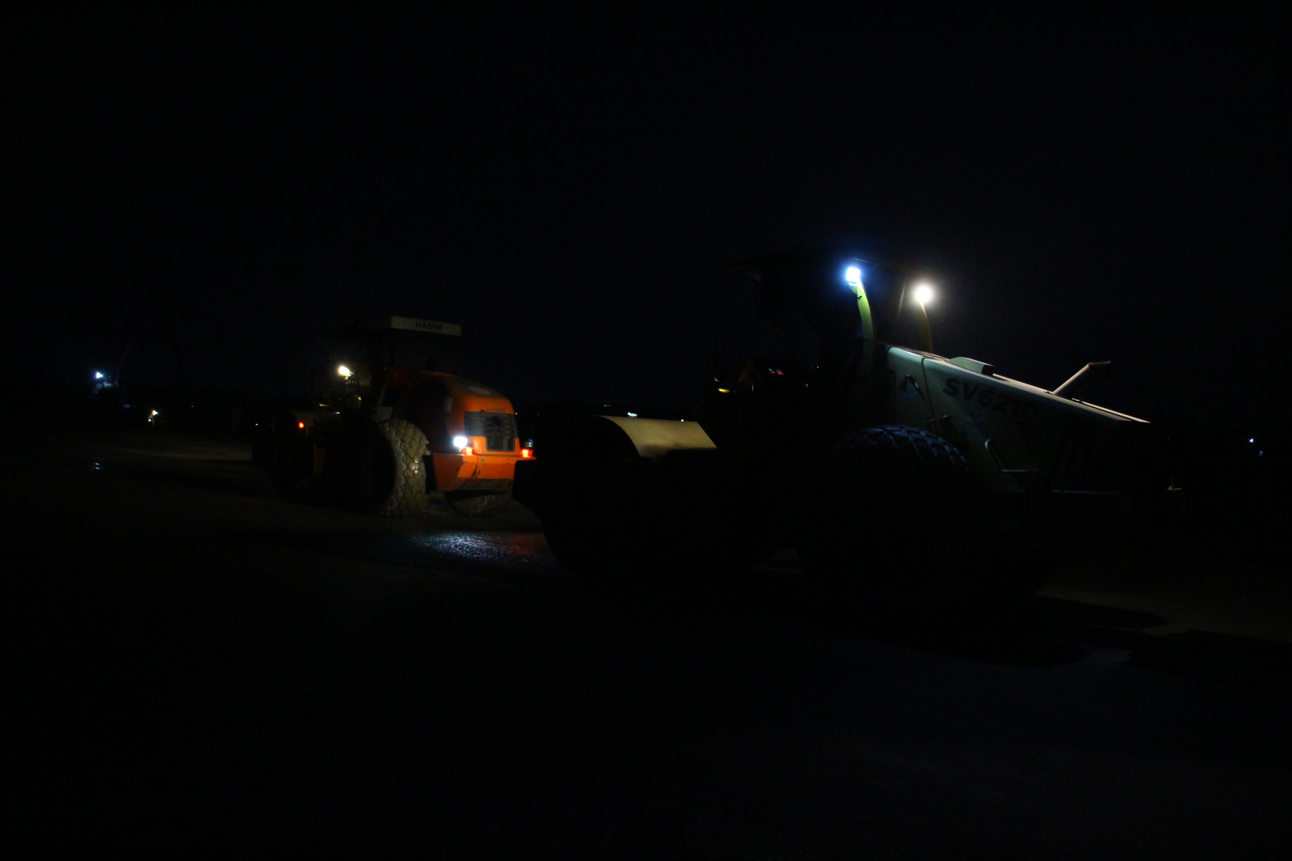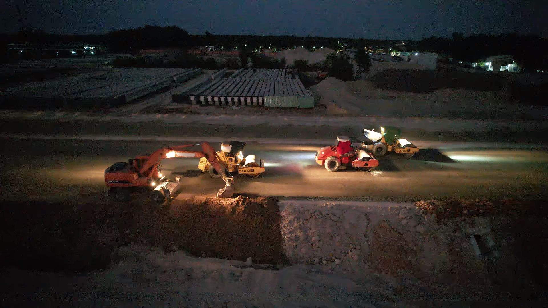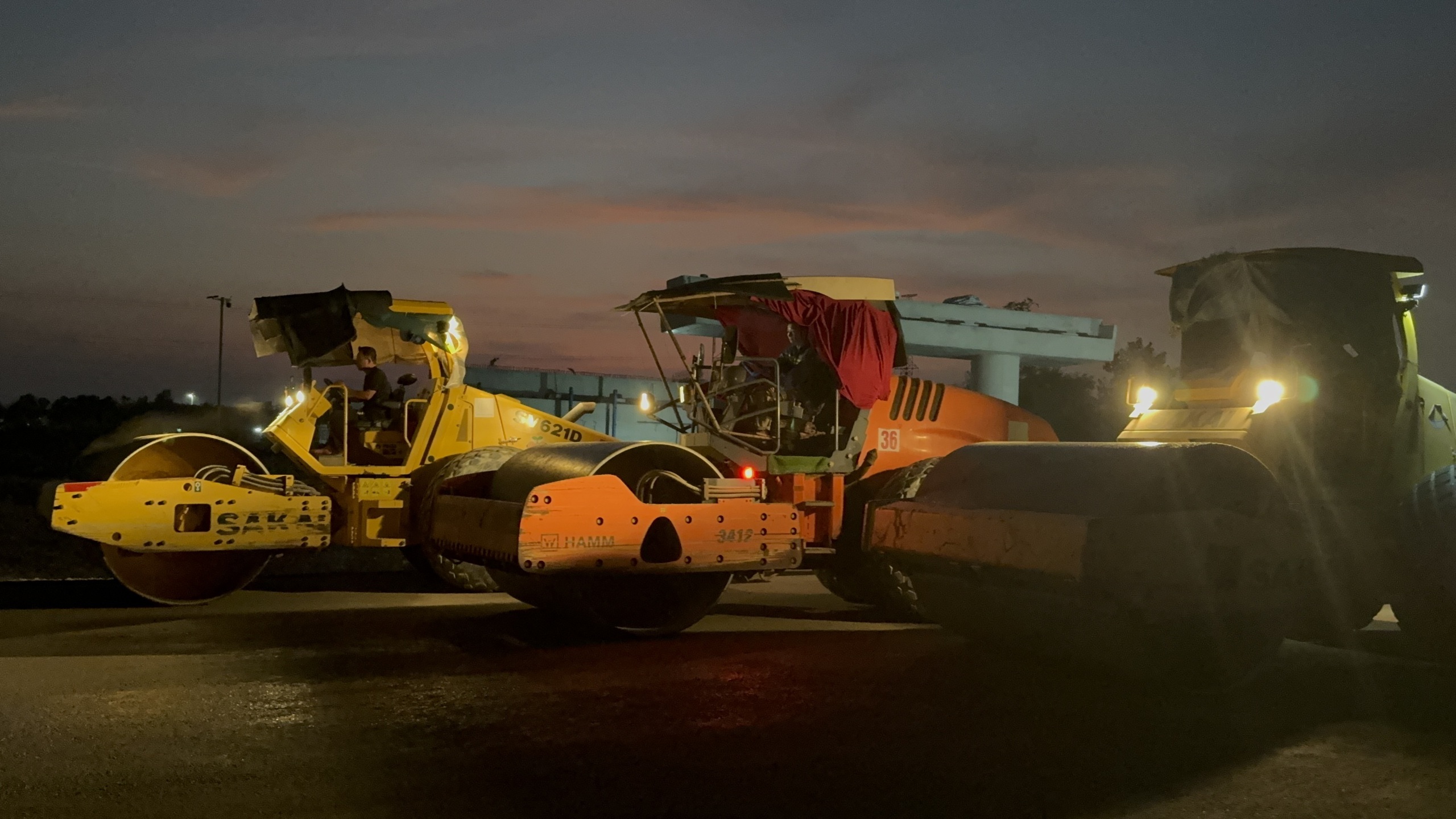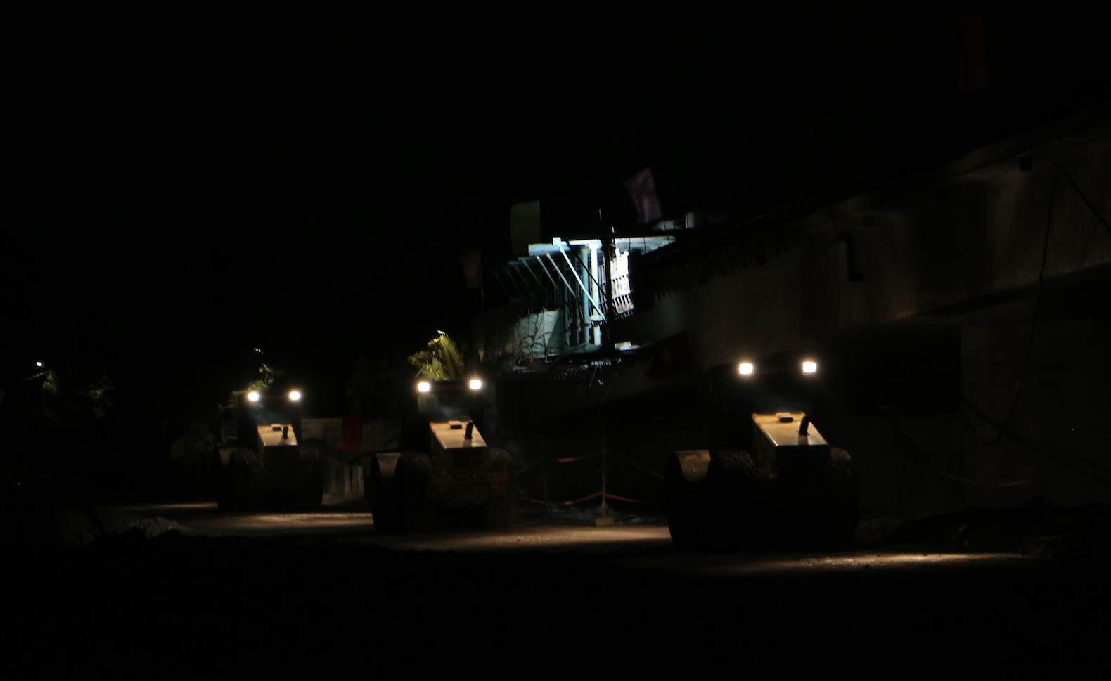 Tại dự án thành phần 2, các nhà thầu không phút ngơi nghỉ. Đèn công trường sáng rực, máy xúc, xe lu hoạt động không ngừng. Xuyên suốt ngày đêm, hàng trăm chuyến xe vận chuyển đất đá liên tục ra vào công trường. Nhờ vậy, cầu và đường trên tuyến đang dần hình thành với sản lượng trên 45%.