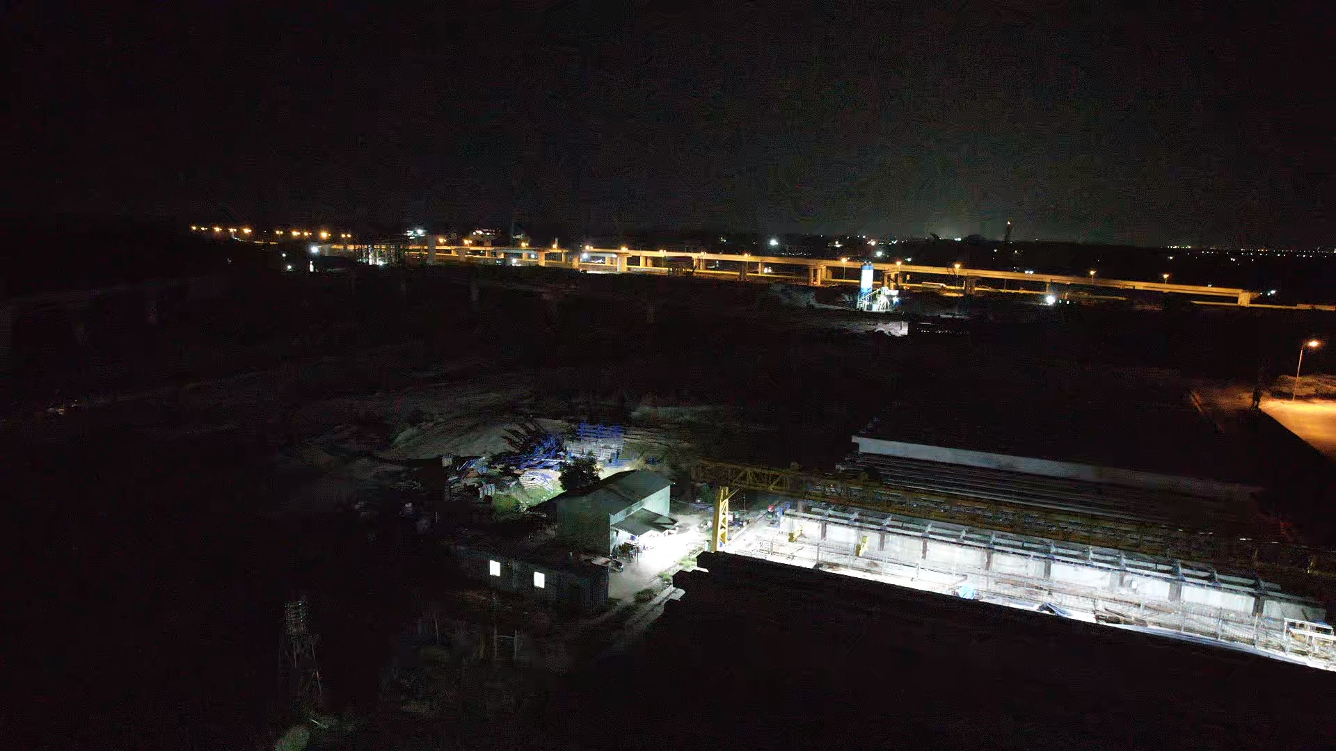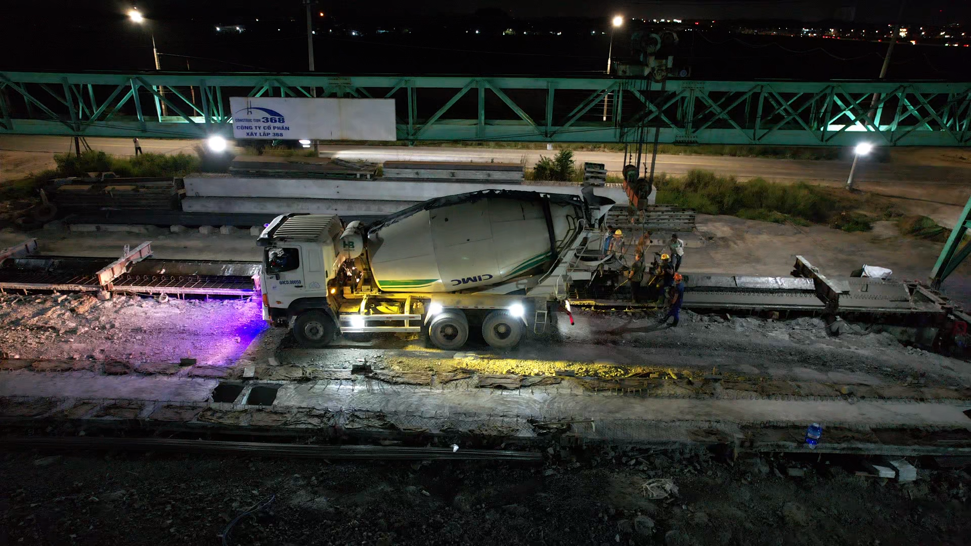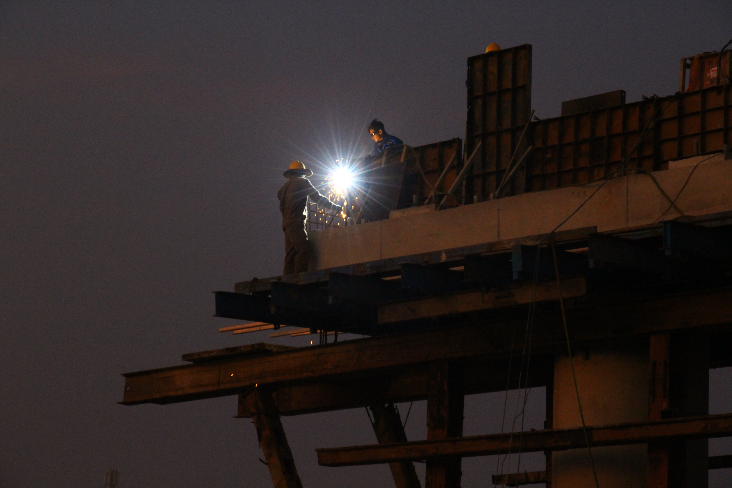Mặc màn đêm bao trùm, công nhân Mai Chí Tuân (phải) vẫn miệt mài hàn những thanh sắt trên cầu tại nút giao Tân Hiệp để kịp bù lại tiến độ thời gian qua.