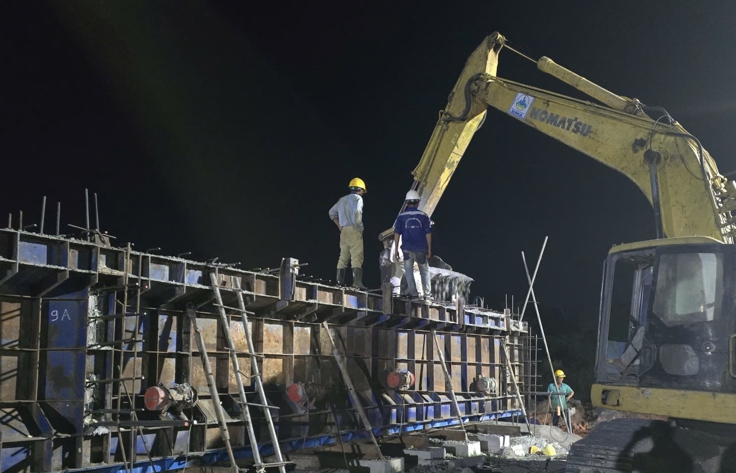 Tại dự án thành phần 1 cao tốc Biên Hòa - Vũng Tàu, màn đêm bao phủ không làm dịu bớt tiếng máy móc, mùi đất mới vẫn nồng trong gió. Ánh đèn quét trên mặt đường, soi rõ từng thao tác của nhóm công nhân đo cao độ, khoan cọc, gia cố xi măng, đúc dầm… Công trường không có khái niệm nghỉ lễ, ngày hay đêm, mọi thứ vẫn vận hành như ngày bình thường, thậm chí căng hơn. Nhờ chạy đua tốc độ sau khi có mặt bằng, đến nay, sản lượng đã trên 30%.